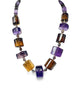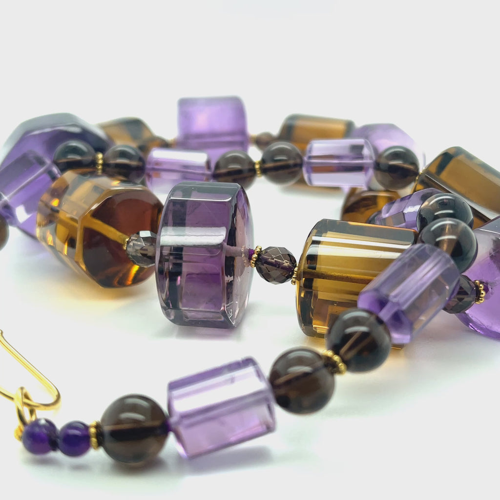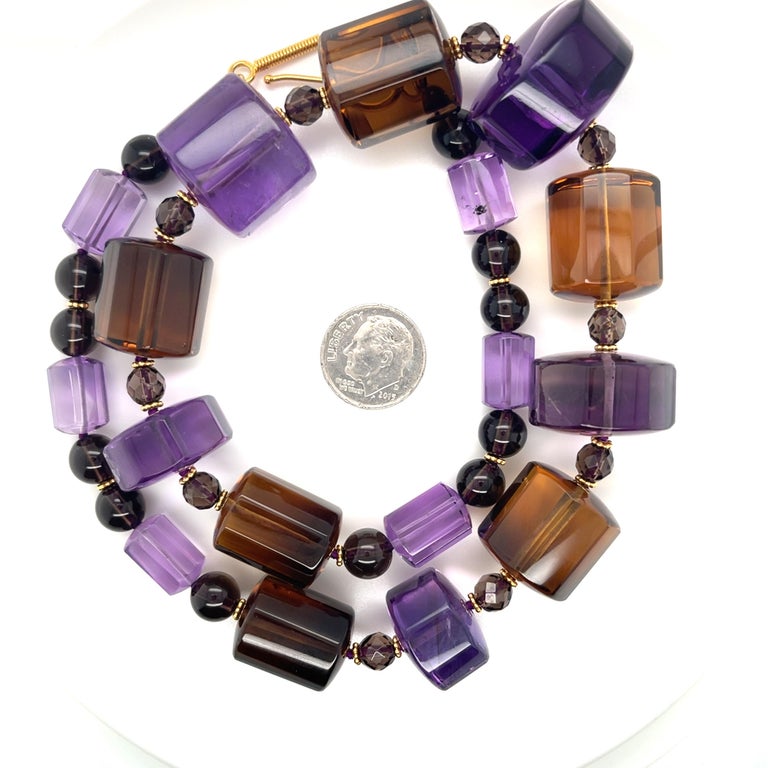 This eye-catching necklace features bold, faceted amethyst and smoky topaz barrel shaped beads beautifully arranged with 18k yellow gold accents. The large, transparent amethyst beads have gorgeous purple and lilac color and graduate in size, with the center amethyst measuring 1 inch in diameter, and the smallest measuring 5/16" in diameter. The smoky topaz barrel beads have warm coffee coloring and together with the amethyst, create a bold and sophisticated color pairing that is perfect for all seasons. Faceted round topaz beads and 18k yellow gold spacers allow each barrel bead to stand out on its own in this unique collection. The necklace is finished with polished round smoky topaz and amethyst beads and a large 18k yellow gold hook clasp that brings the finished length to 20 inches. A beautifully dramatic and bold statement necklace that is perfect for both daytime and evening wear!