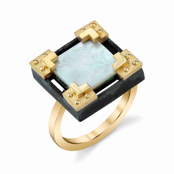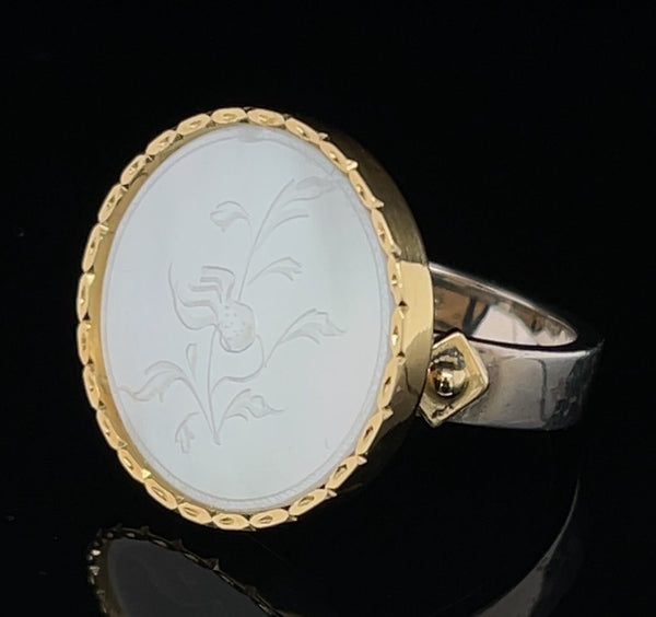 Bezel Set Antique Mother of Pearl Gaming Counter, Silver, Yellow Gold Ring