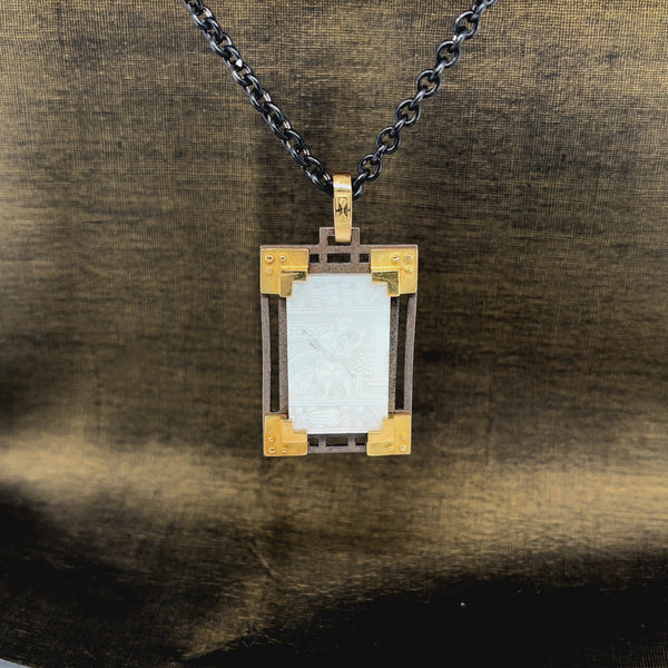 Antique Mother-of-Pearl Pendant in Gold and Silver with Blackened Steel Chain