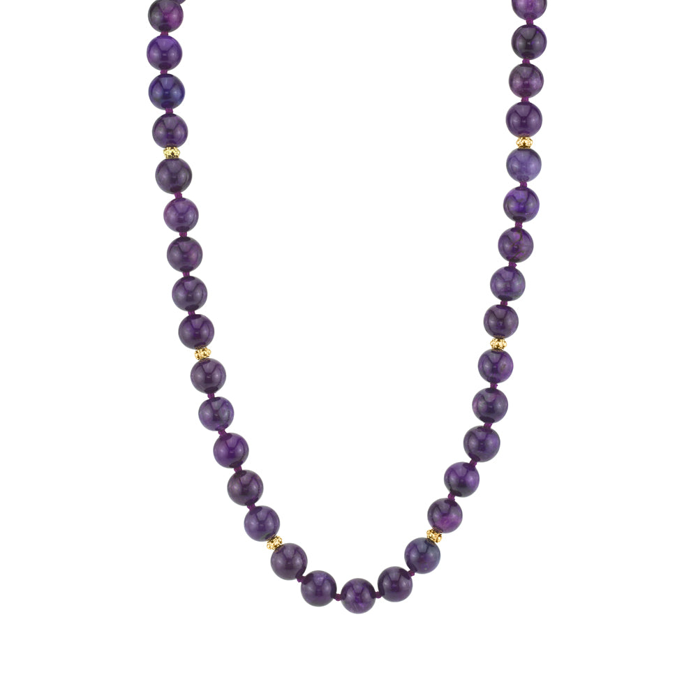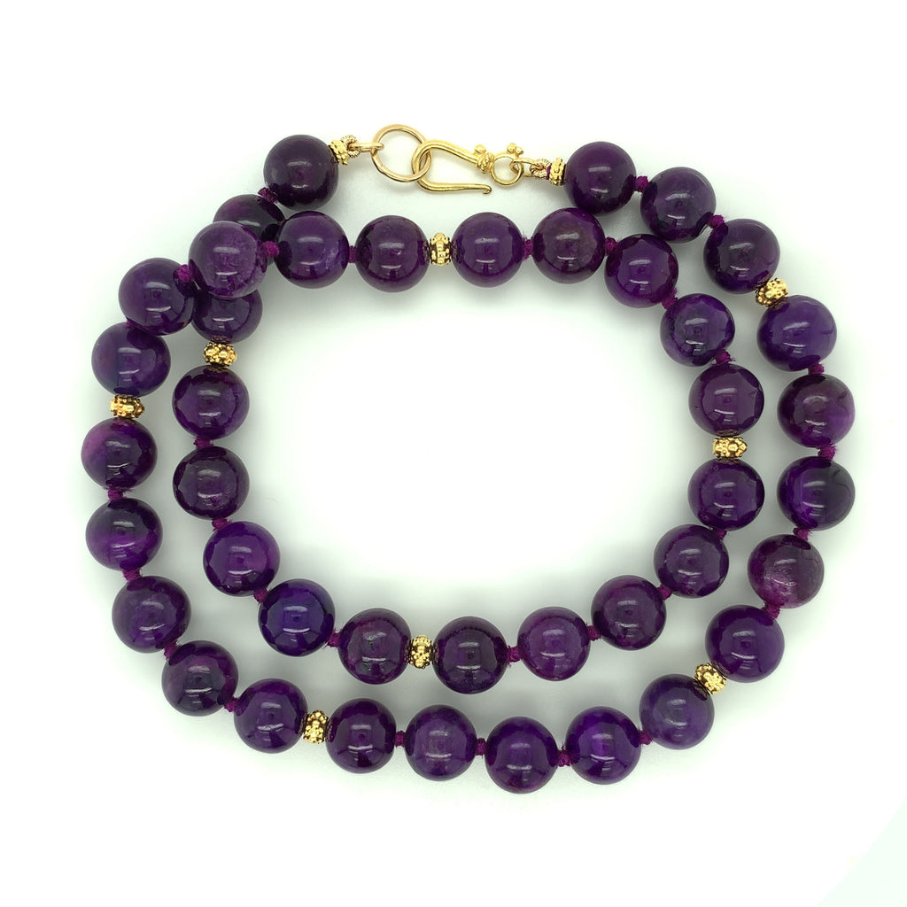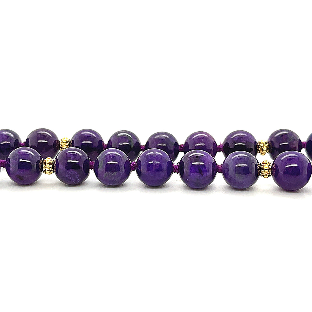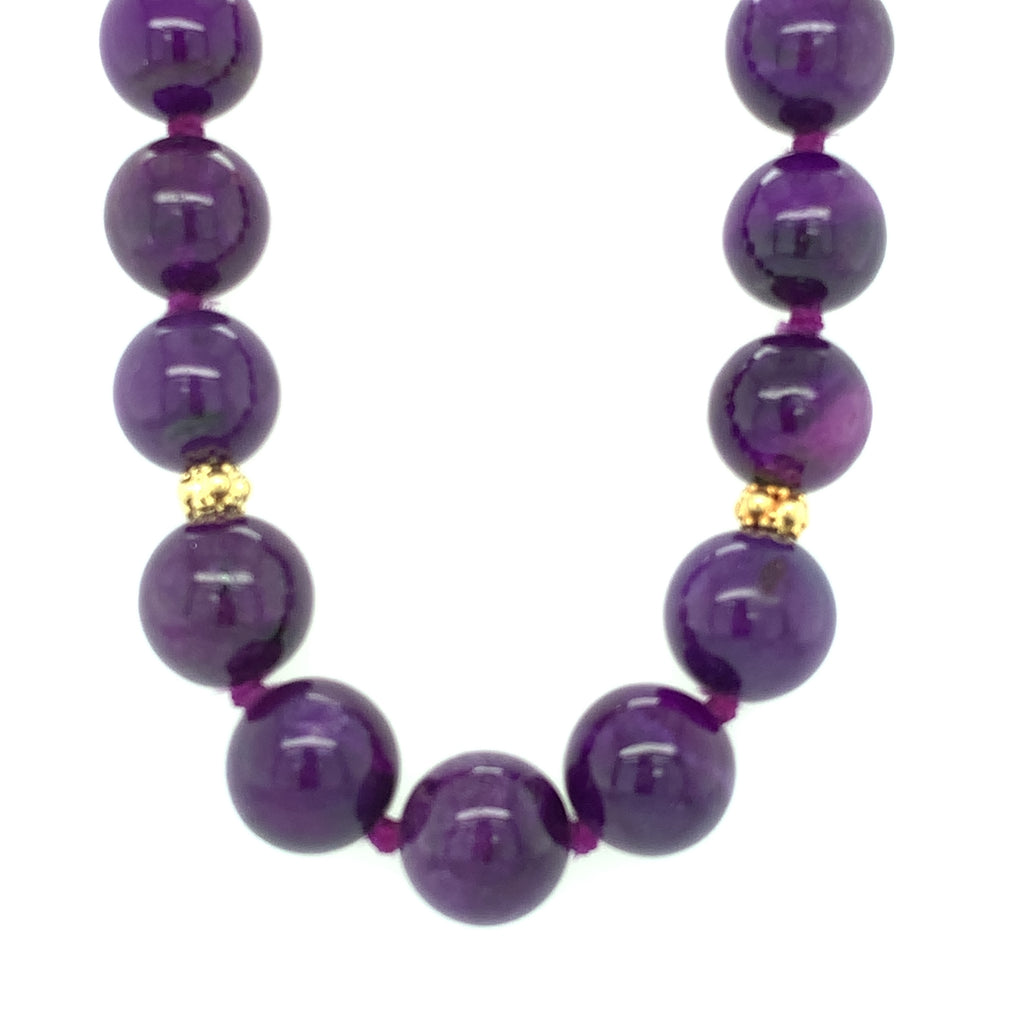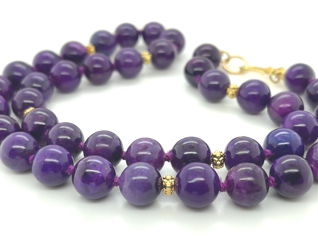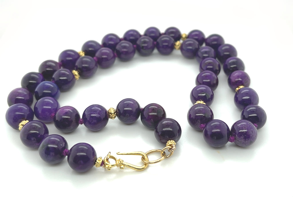 This striking necklace features 10.00mm beads fashioned from sugilite, a gorgeous, relatively rare mineral from South Africa that is prized for its intense purple color. These fine-quality beads are extremely well-matched, have rich, purple color and are beautifully semi-translucent. They have been hand strung with 22k yellow gold spacers and finished with an 18k yellow gold clasp. Beautifully versatile and a wonderful way to update your jewelry wardrobe! Necklace measures 18.5 inches in length.