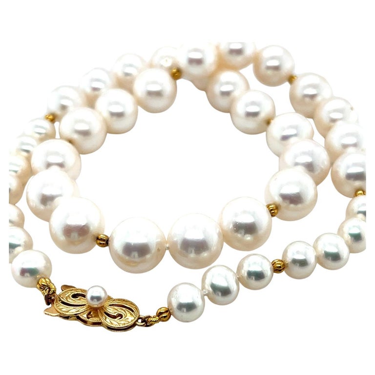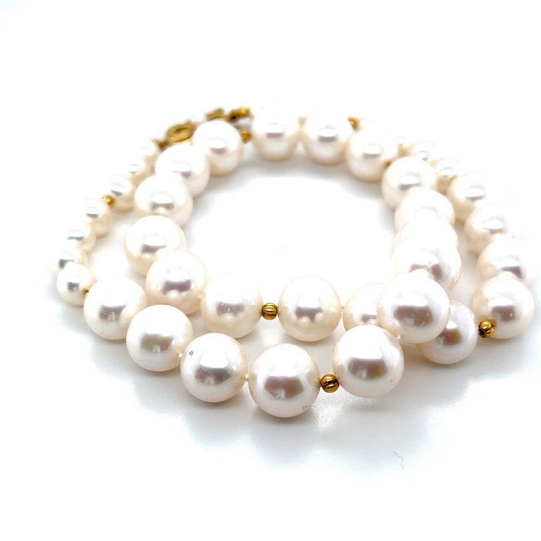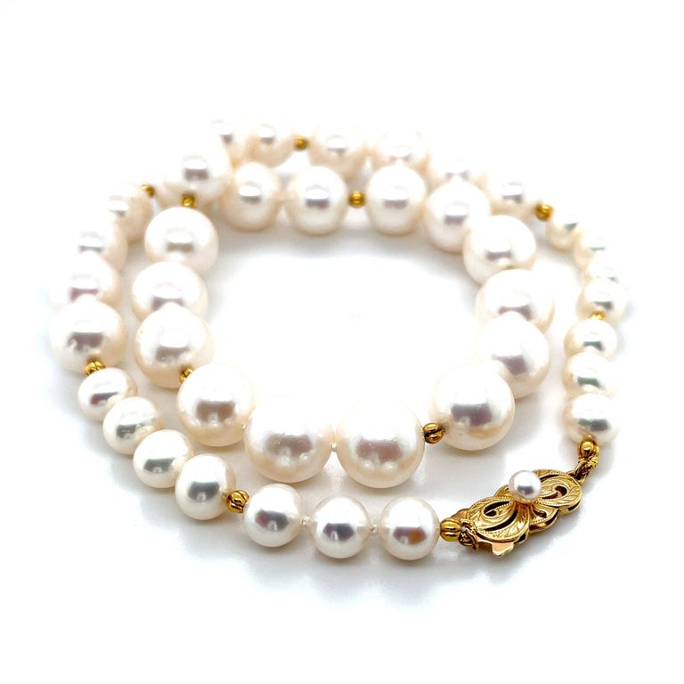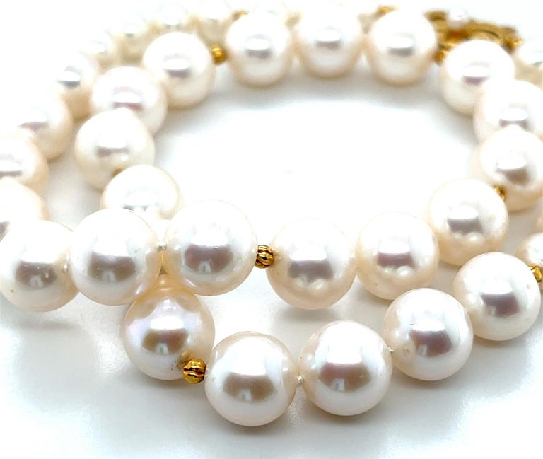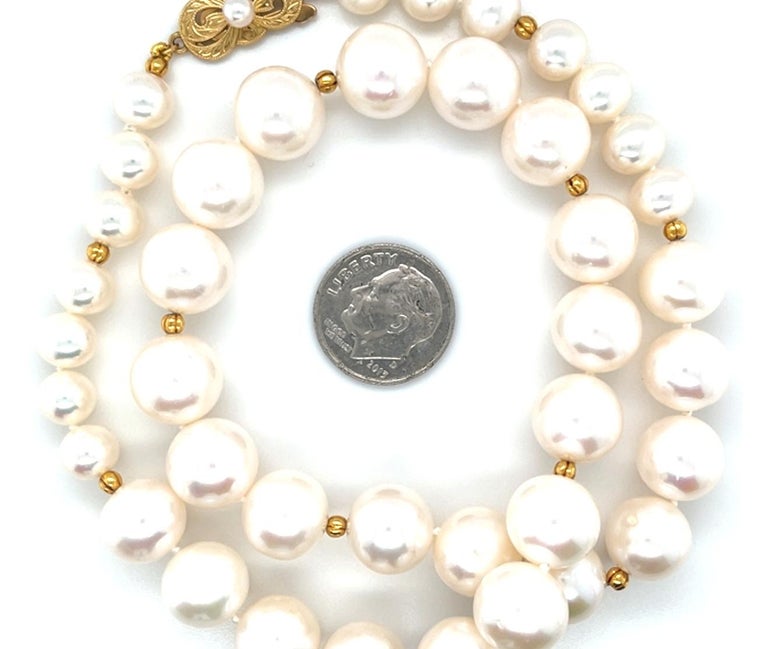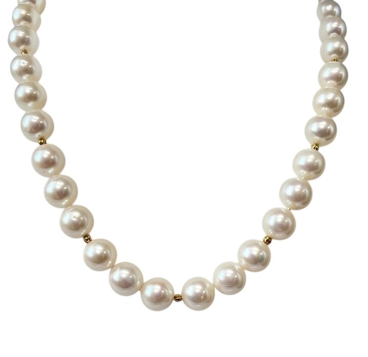 This beautiful necklace combines beautifully matched 10mm and 7mm round freshwater pearls with 18k yellow gold accent beads for a modern update on a timeless classic! The stunning white pearls have gorgeous luster and their large size gives this necklace a rich and luxurious feel. The detailed 18k yellow gold clasp is accented with a petite pearl and brings the necklace to a finished length of 17.5 inches. Suitable for any age, and perfect for both daytime and evening wear. A wonderful staple for any fine jewelry wardrobe!