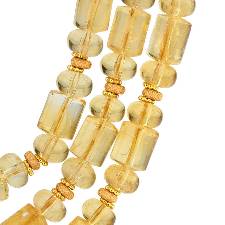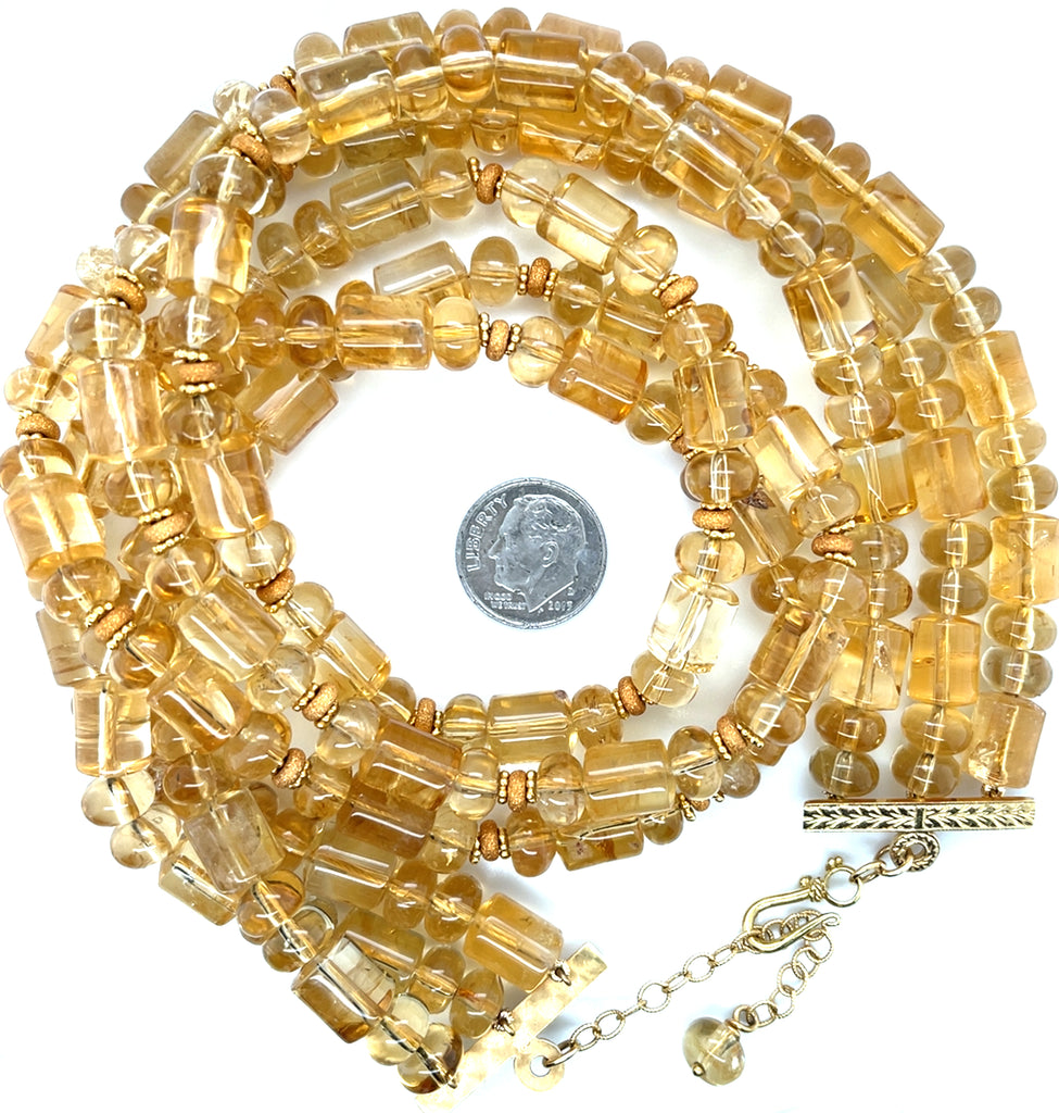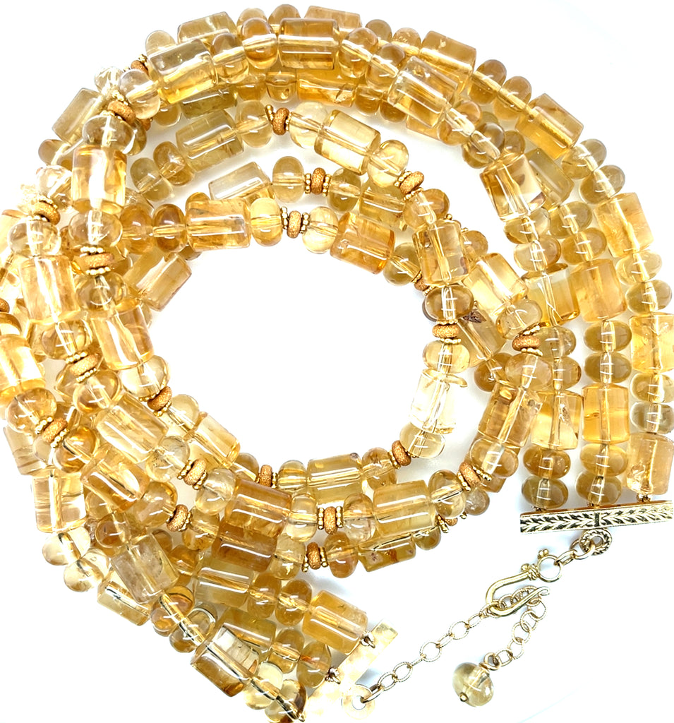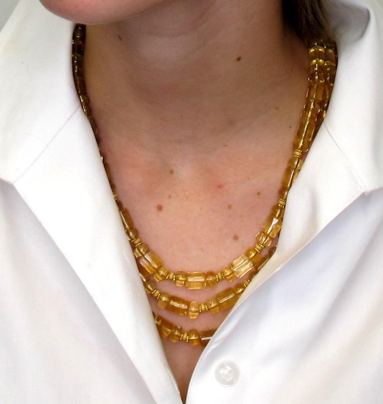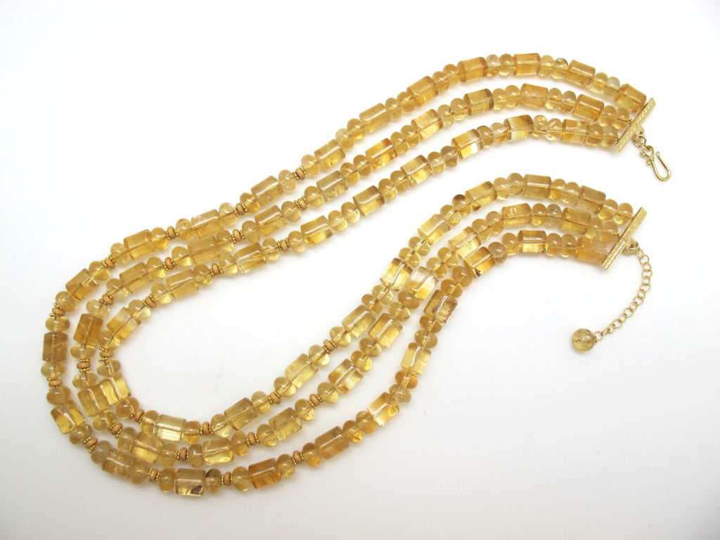 This necklace is so pretty and unusual - and the neutral color goes with everything! It features 3 strands of highly transparent, golden citrine beads of various sizes and shapes, hand-strung with 14k and 18k yellow gold rondelle spacers for extra sparkle. Make this flattering golden necklace your signature piece!