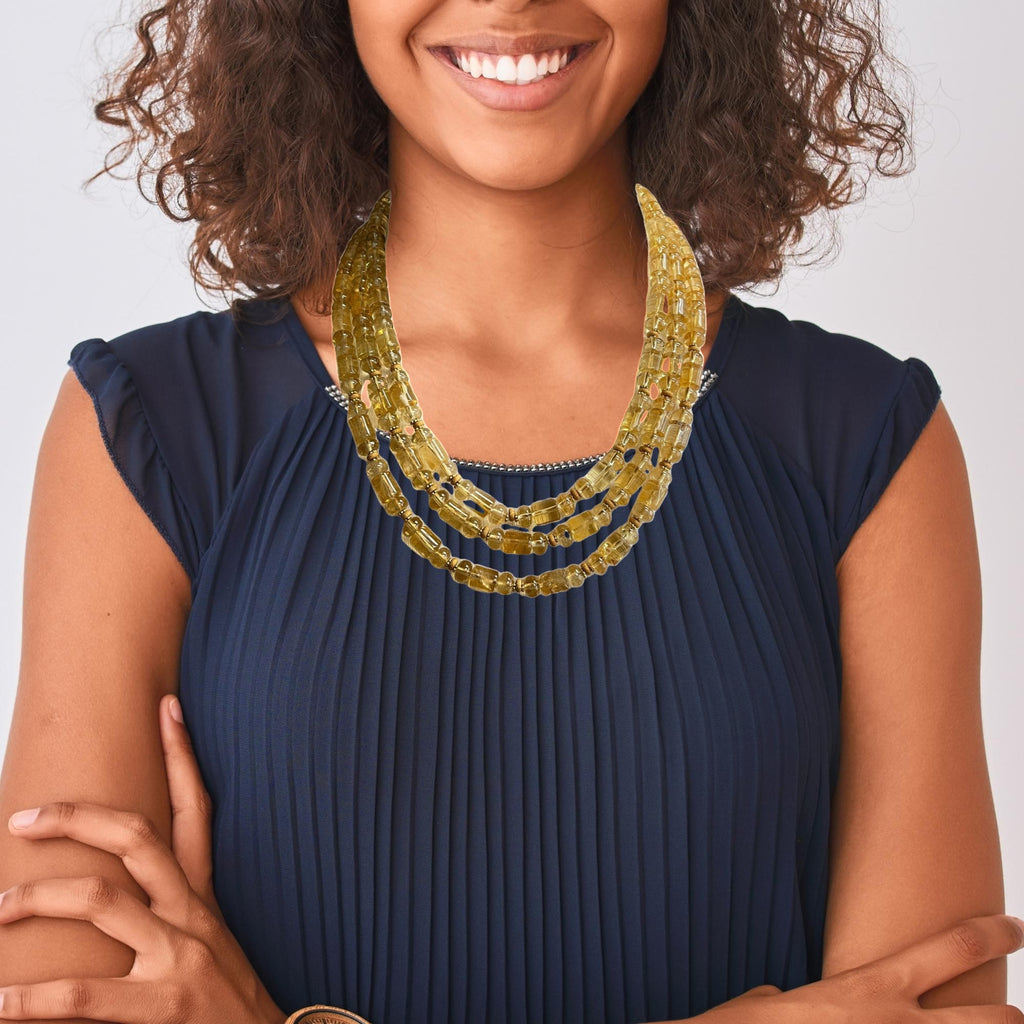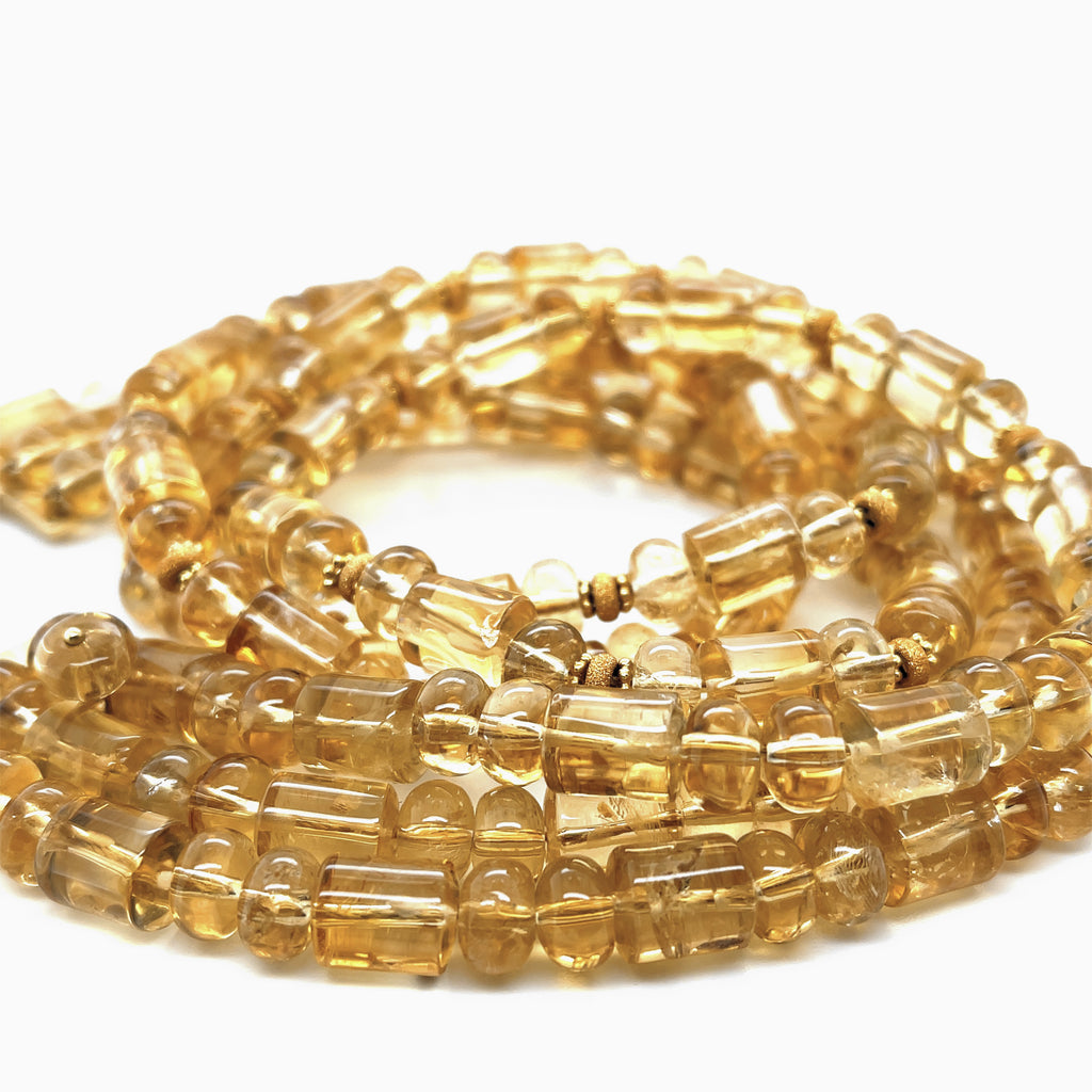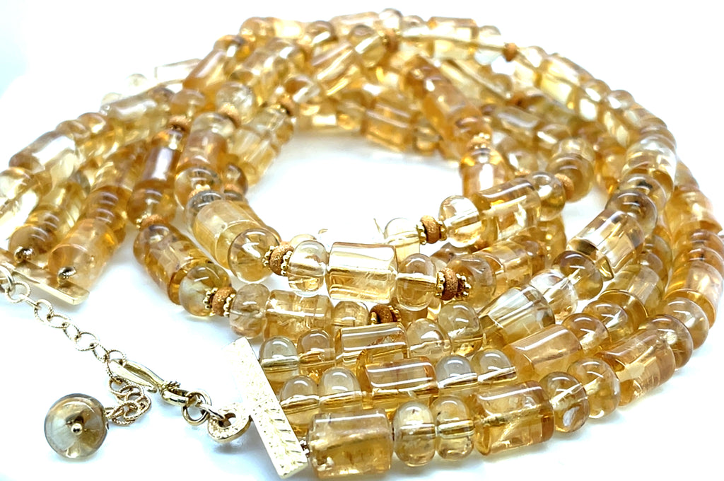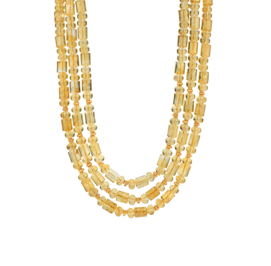 This necklace is so pretty and unusual - and the neutral color goes with everything! It features 3 strands of highly transparent, golden citrine beads of various sizes and shapes, hand-strung with 14k and 18k yellow gold rondelle spacers for extra sparkle. Make this flattering golden necklace your signature piece!