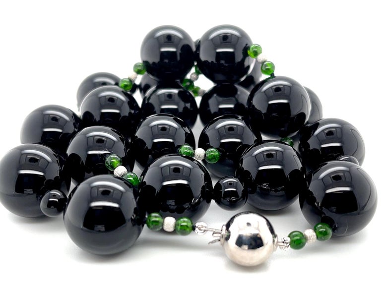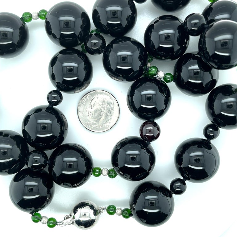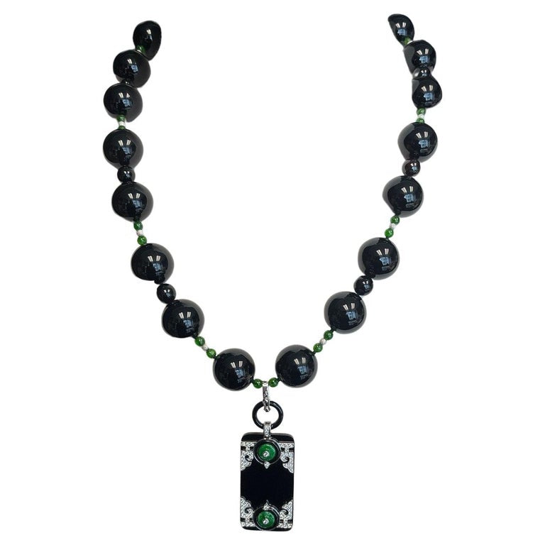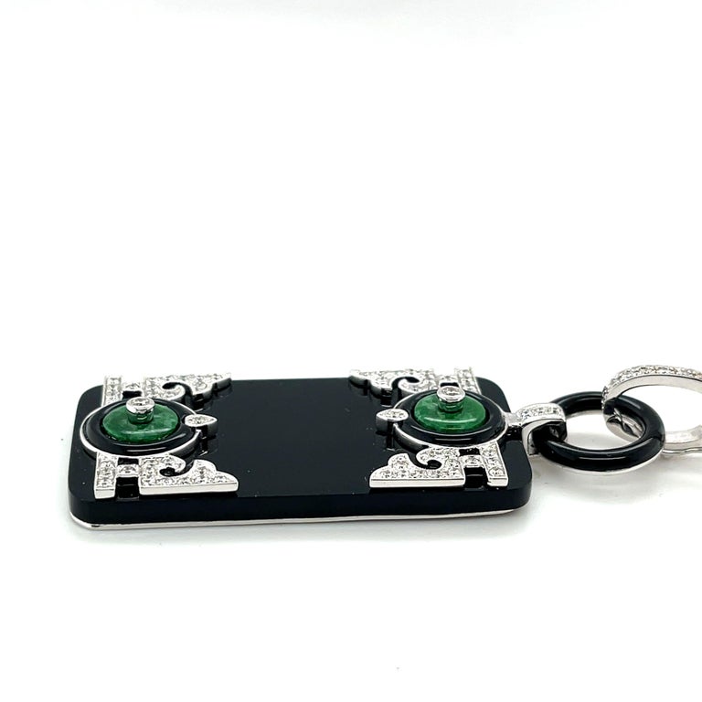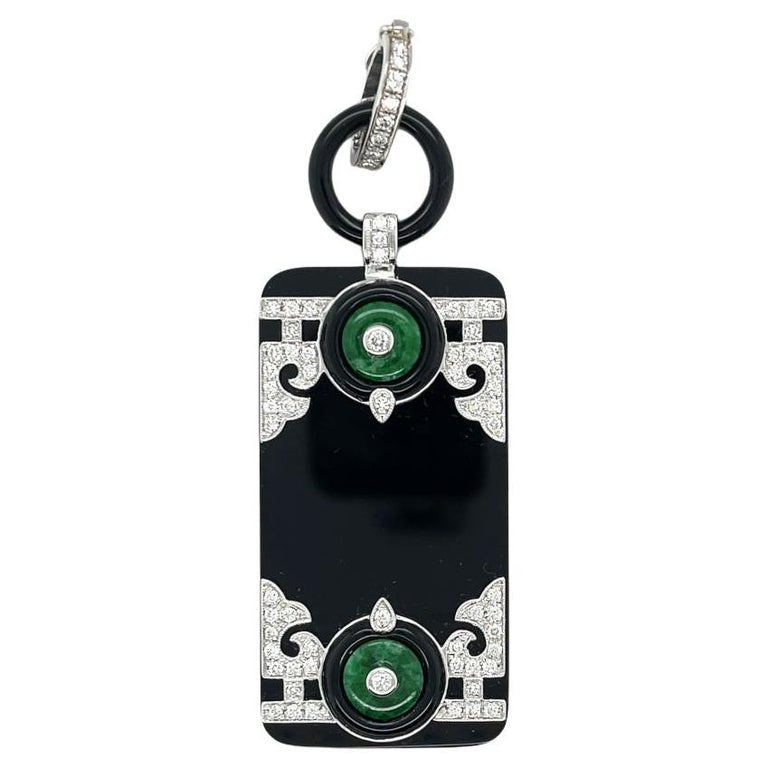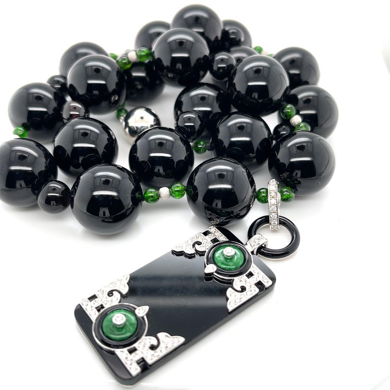 diamond-set 18k white gold motifs and rings carved of onyx and green jade. The custom-made bail is set with brilliant diamonds and has a hinged back that allows the pendant to be clipped over a chain, pearls, or beads such as the dramatic onyx and chrome diopside necklace shown here is included. This original design can be dressed up or down, with versatility that makes it perfect for everyday and special occasions!