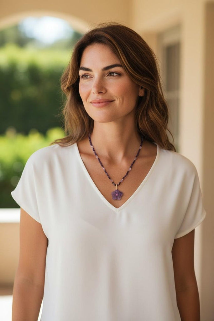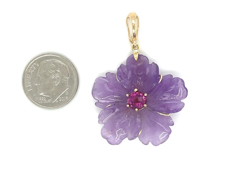 This unique necklace features a beautiful floral amethyst pendant set in 18k yellow gold on a strand of pastel and royal purple amethyst beads. The flower pendant has been hand carved from a single amethyst crystal with delicate purple color, and in the center of the flower sits a sparkling, pinkish purple mulberry garnet. The strand of deep purple amethyst beads is accented with bright, 14k yellow gold spacers, larger, pastel amethyst beads and a 14k yellow gold clasp. This is a uniquely versatile piece of jewelry! It is actually three pieces in one, as the bead strand can be worn either with the pendant or by itself, and the pendant's 14k yellow gold bail is a hinged "enhancer" that can be clipped over beads, pearls, or even on a chain! This necklace is so pretty, feminine and wearable for all occasions! The pendant measures approximately 1.50"across and 1 1/4" in length, including the bail. Necklace measures 18" in length. A beautiful gift for yourself or someone you love. Guaranteed to never wilt!