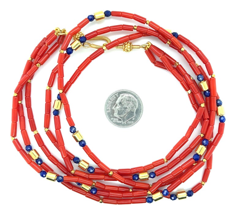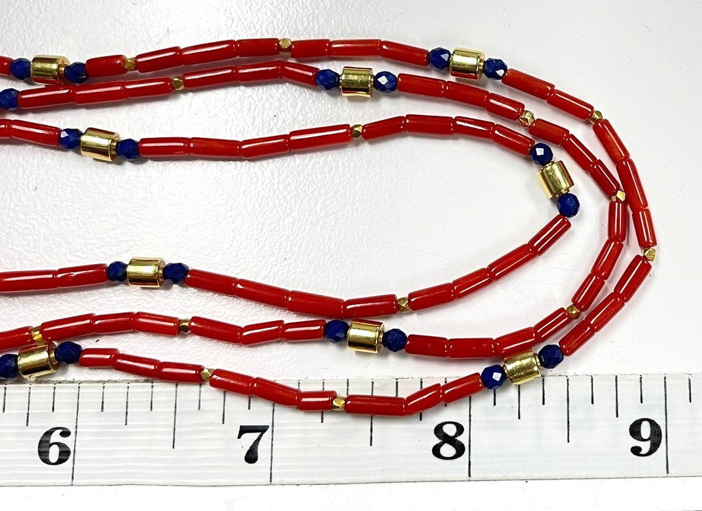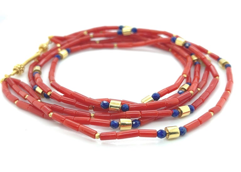 Mediterranean Red Coral and Lapis Beaded Necklace with 18k Yellow Gold Accents