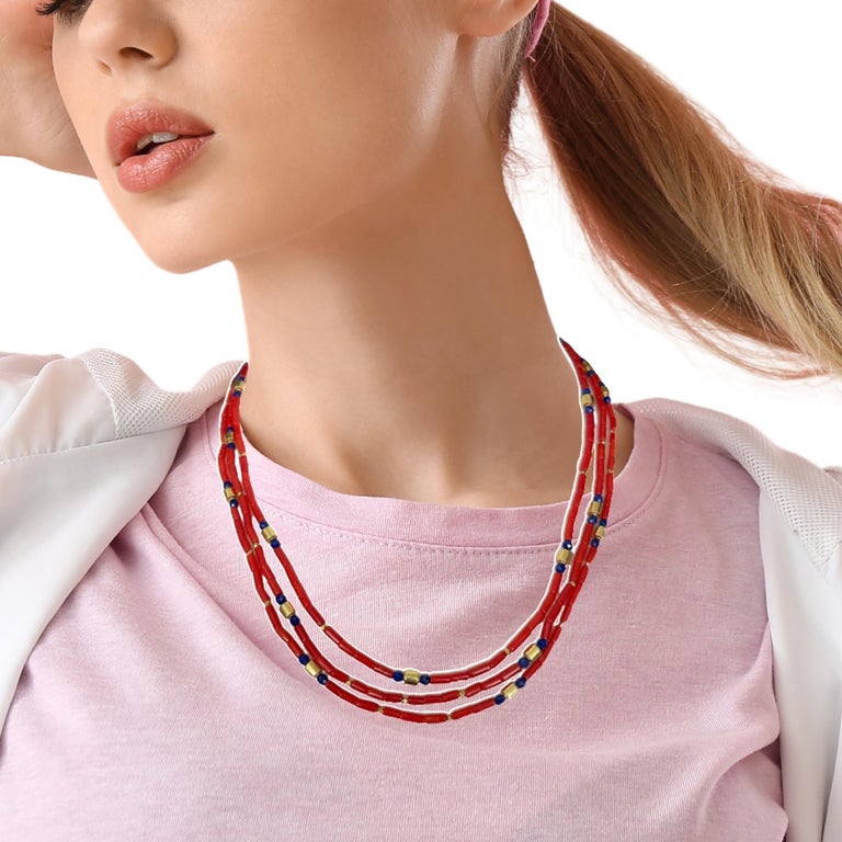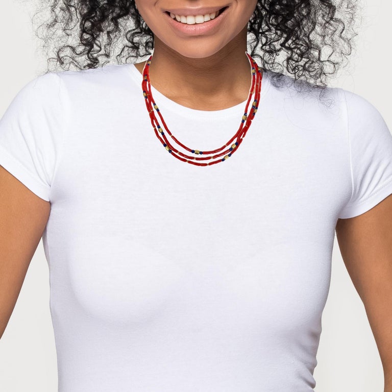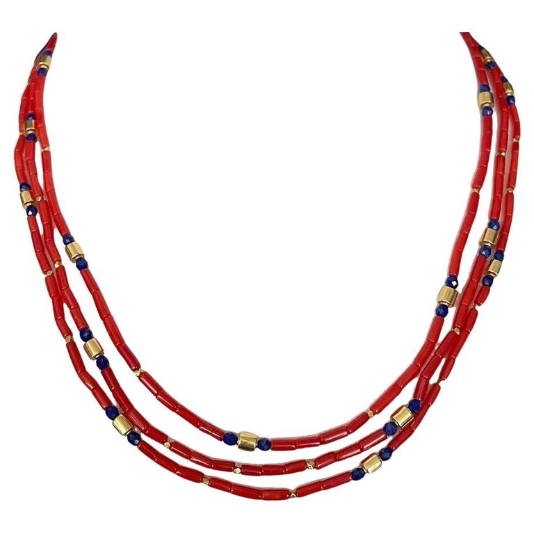 This natural color coral necklace features 3 strands red coral tube beads beautifully arranged with 18k yellow gold spacers and blue lapis accents.  The 5mm coral beads have deep red color that contrasts nicely with the royal blue lapis and bright yellow gold. The 18k yellow gold hook clasp has an artistically elaborate "old world" design that is the perfect finishing touch for this necklace. The three strands nest beautifully to complement a variety of necklines. Necklace measures 18"-19" long.