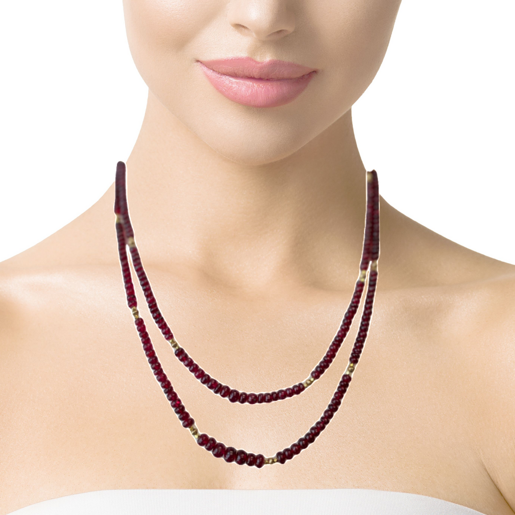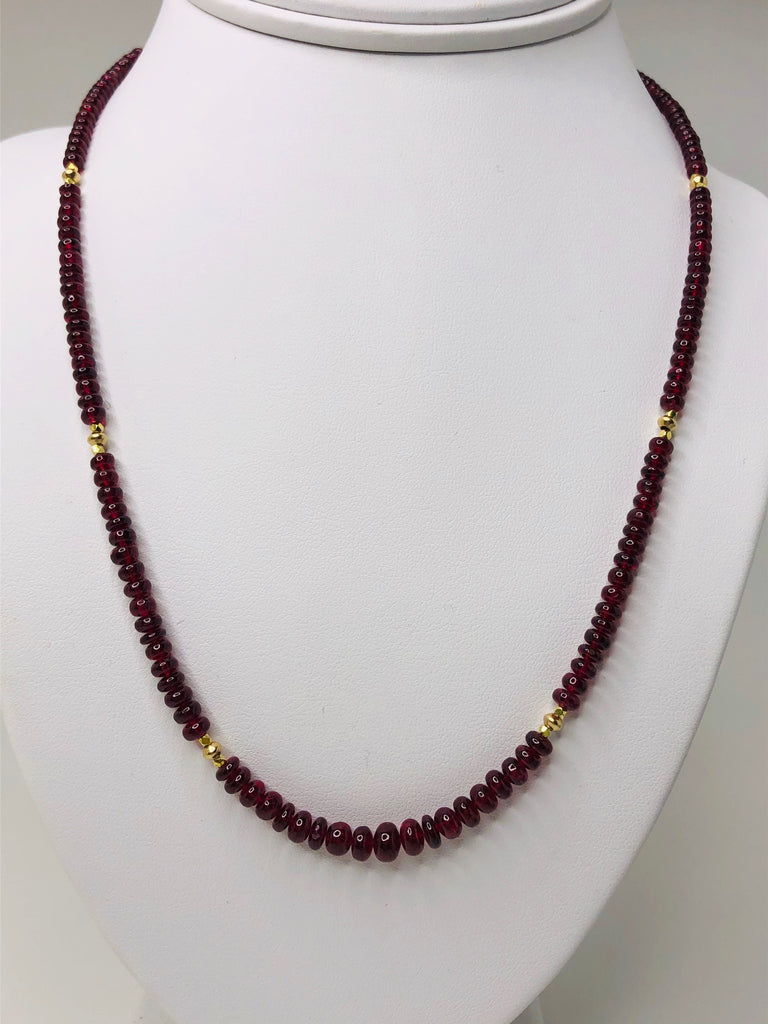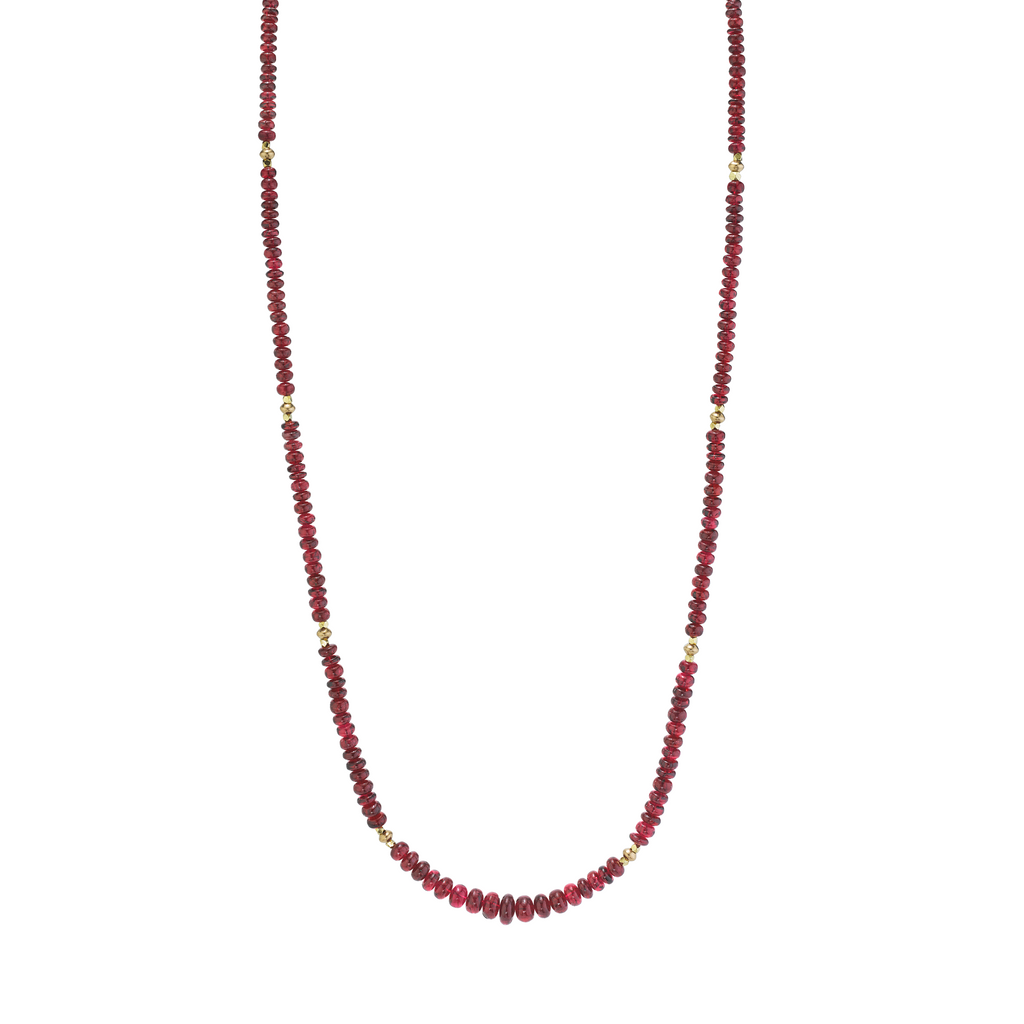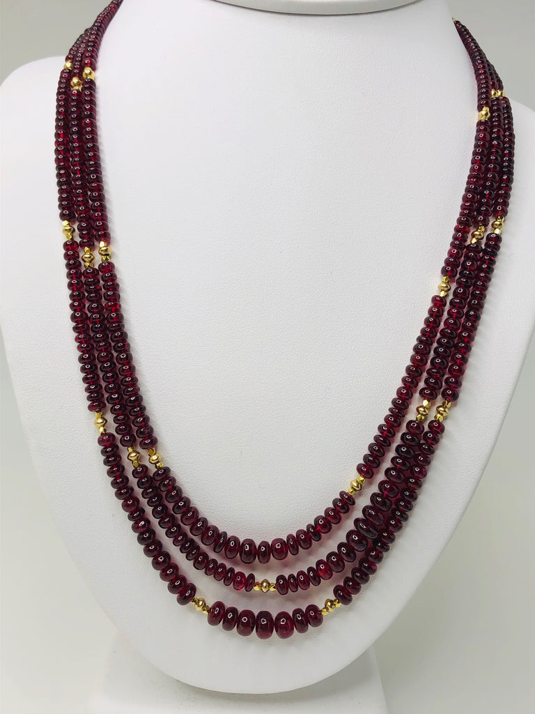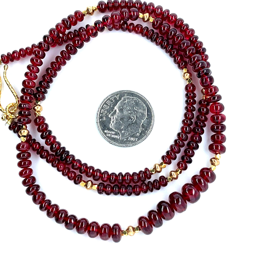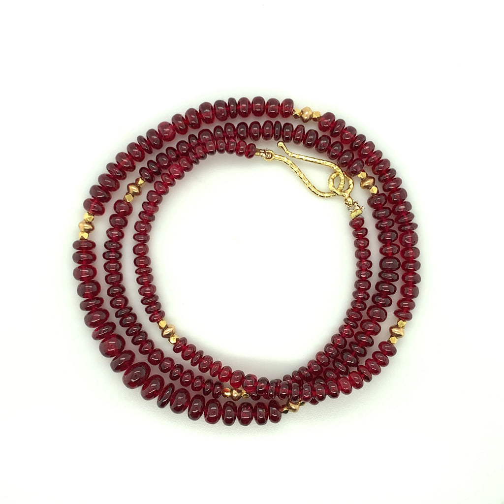 This strand of fine quality spinel beads would be at home in a 19th century ballroom or a 21st century boardroom! Rich, pomegranate red oval rondelles have been hand strung with 22k yellow gold spacers and an 18k yellow gold clasp in an elegant 19-inch strand. I have never seen red spinel beads before! Spinels have often been mistaken for fine rubies throughout history and looking at this strand, it is easy to see why. The beads, graduating in size from 3.00 to 6.50 millimeters, are of the finest quality and very rare indeed. For a look of unparalleled luxury, this strand can be nested with one or even two additional strands of our spinel beads, as shown in the photographs. NCK-1073 measures 20 inches, and NCK-1074 measures 21 inches. Each strand is sold separately.