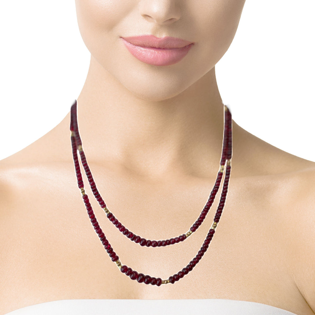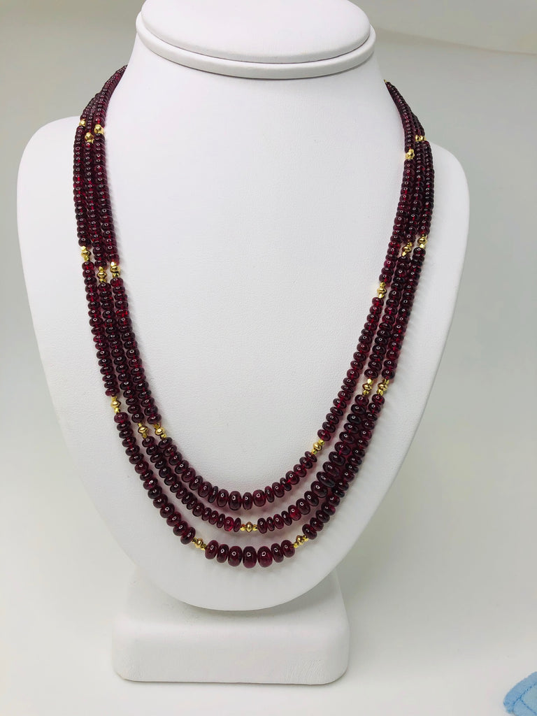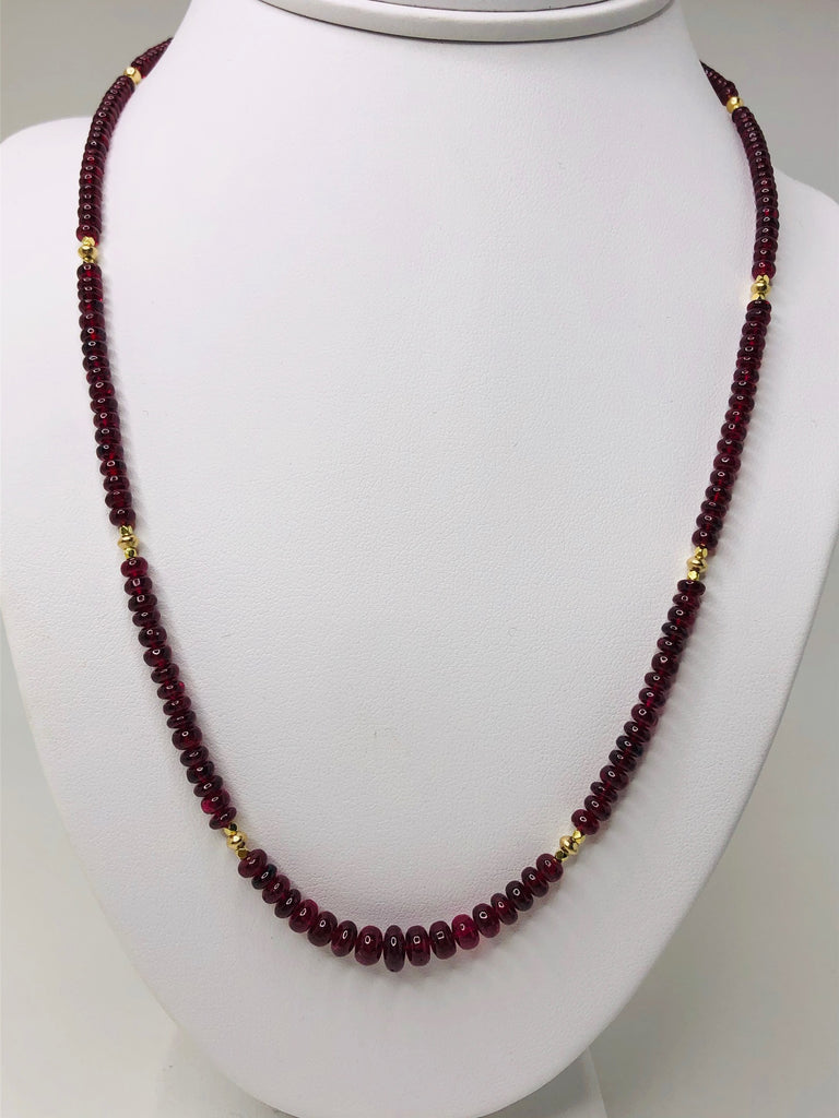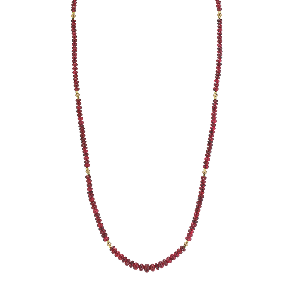 This strand of fine quality spinel beads would be at home in a 19th century ballroom or a 21st century boardroom! Rich, pomegranate red oval rondelles have been hand strung with 22k yellow gold spacers and an 18k yellow gold clasp in an elegant 20-inch strand. I have never seen red spinel beads before! Spinels have often been mistaken for fine rubies throughout history and looking at this strand, it is easy to see why. The beads, graduating in size from 3.00 to 6.50 millimeters, are of the finest quality and very rare indeed. For a look of unparalleled luxury, this strand can be nested with one or even two additional strands of our spinel beads, as shown in the photographs. NCK-1072 measures 19 inches, and NCK-1074 measures 21 inches. Each strand is sold separately.