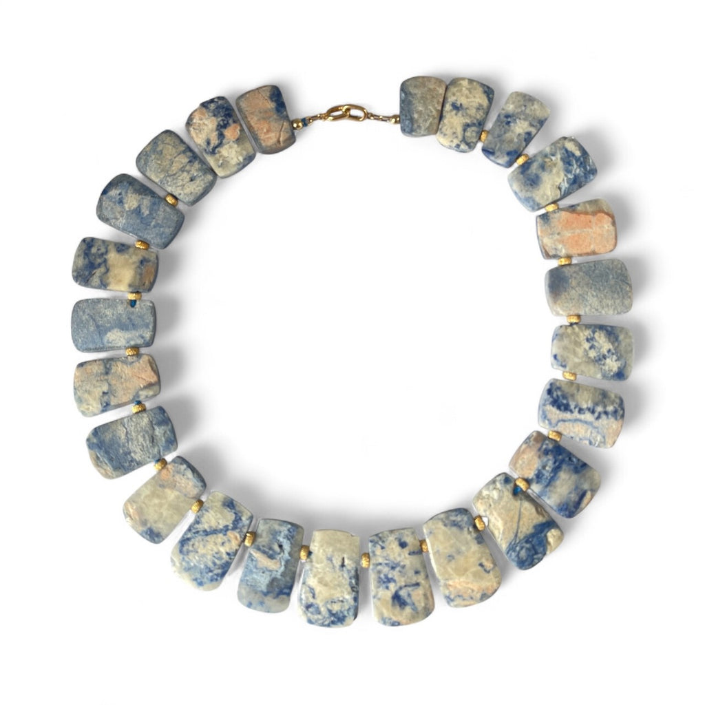 This eye-catching blue dumortierite necklace is not only unusual and beautiful, it is reversible, making it versatile! Harder than lapis on the Mohs Hardness scale, dumortierite with its stunning blue color is a relatively unknown mineral and hard to find in fine quality such as the tiles in this collection. These gem-quality tiles have a tapered rectangular shape and graduate ever so slightly, with the largest tile measuring 1-1/8" long x 3/4" at its widest dimension. The tiles are polished on one side that showcases the soft, yet rich blue, peach and white coloring as well as the texture of these gems. The reverse side of the necklace has a more casual look with medium denim blue coloring on the unpolished, "rough" looking tiles. Both sides are wonderful examples of nature's beauty, and the reversible nature of this necklace makes it easy to dress up or down to achieve different looks! 14k yellow gold stardust beads accent the tiles and elevate the necklace to fine-jewelry status. The pretty yellow gold hinged clasp is 14k yellow gold and brings the necklace to a finished length of 18" inches. A naturally beautiful statement piece!