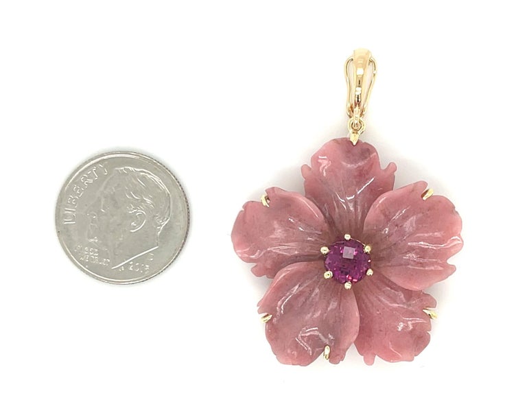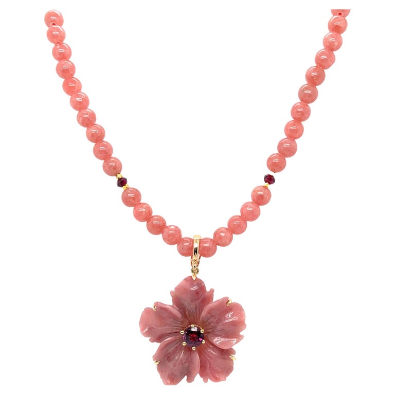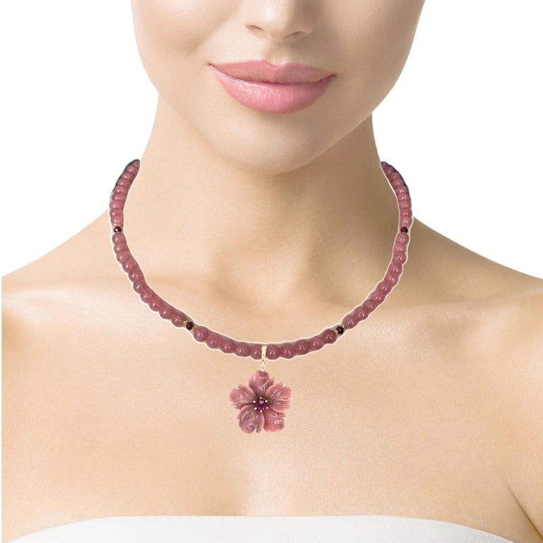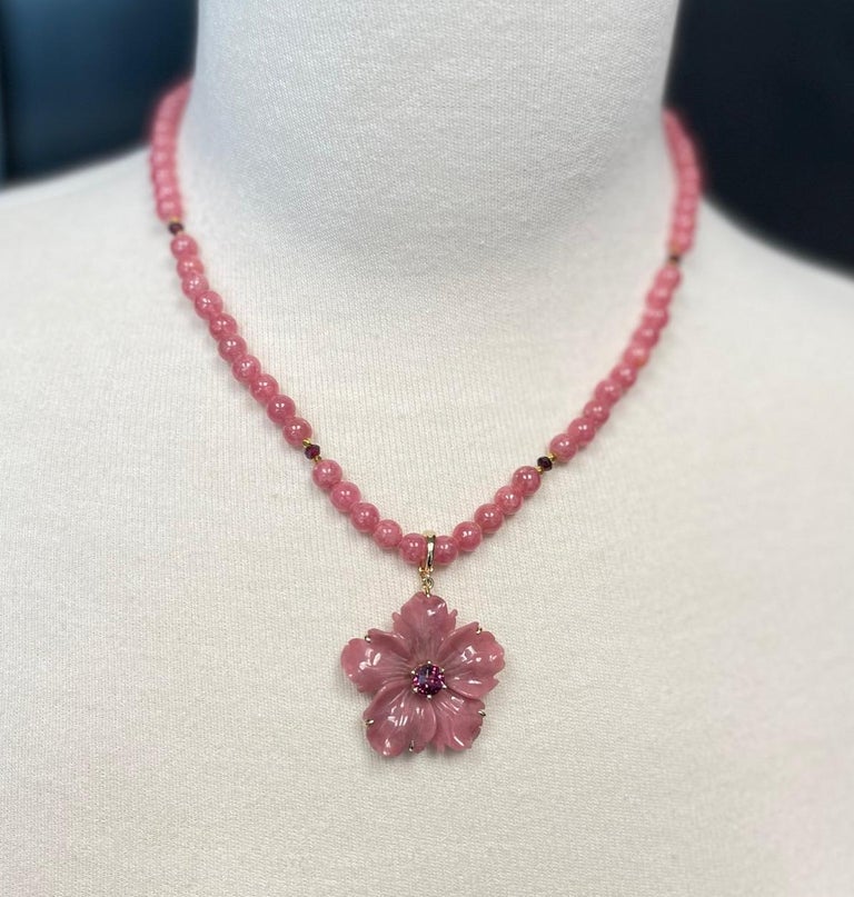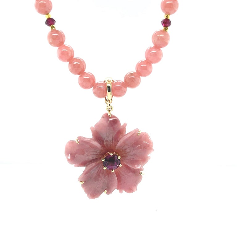 This eye-catching necklace features a beautifully hand-carved rhodonite floral pendant on a lovely strand of rose-colored rhodochrosite beads. The 6mm beads have been hand strung on silk thread and accented with richly colored, round garnet beads that glisten like fresh pomegranate seeds! 18k yellow gold accents finish this pretty necklace, which measures 18 inches in length and can be worn with or without the pendant. The pendant was hand-carved from a single piece of fine rose colored rhodonite and is set with a sparkling mulberry rhodolite garnet set in 18k yellow gold. The 14k yellow gold enhancer bail can be clipped over other beads, pearls, even a gold chain! Rhodonite, rhodochrosite and rhodolite, all deriving their names from the Greek word for "rose" - a necklace so pretty and versatile, for a true lover of rose-colored gems!