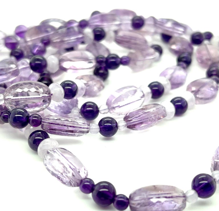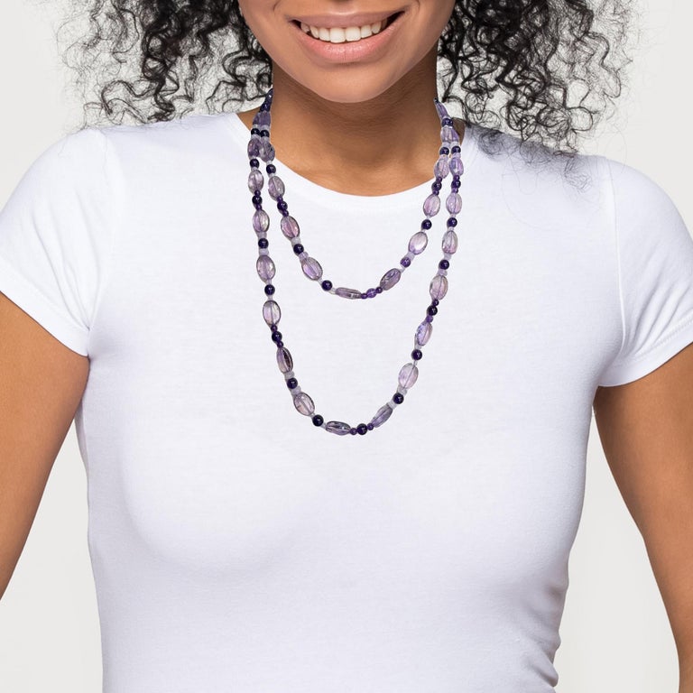 This richly colored 45-inch strand features pastel Rose de France amethyst combined with royal purple amethyst and pink kunzite beads in a wonderfully eye-catching and versatile necklace. The 14 x 10mm oval Rose de France beads catch the light beautifully and are complemented by the lovely kunzite rounds, while royal purple amethyst beads add dramatic pops of color and stunning contrast. Since this is a continuous strand, the necklace can be doubled, with both strands adjusted to whatever lengths you like! Elegant, yet fun, this versatile necklace can be worn day or night and is sure to become one of your all time favorites!
