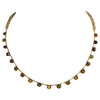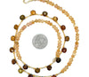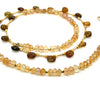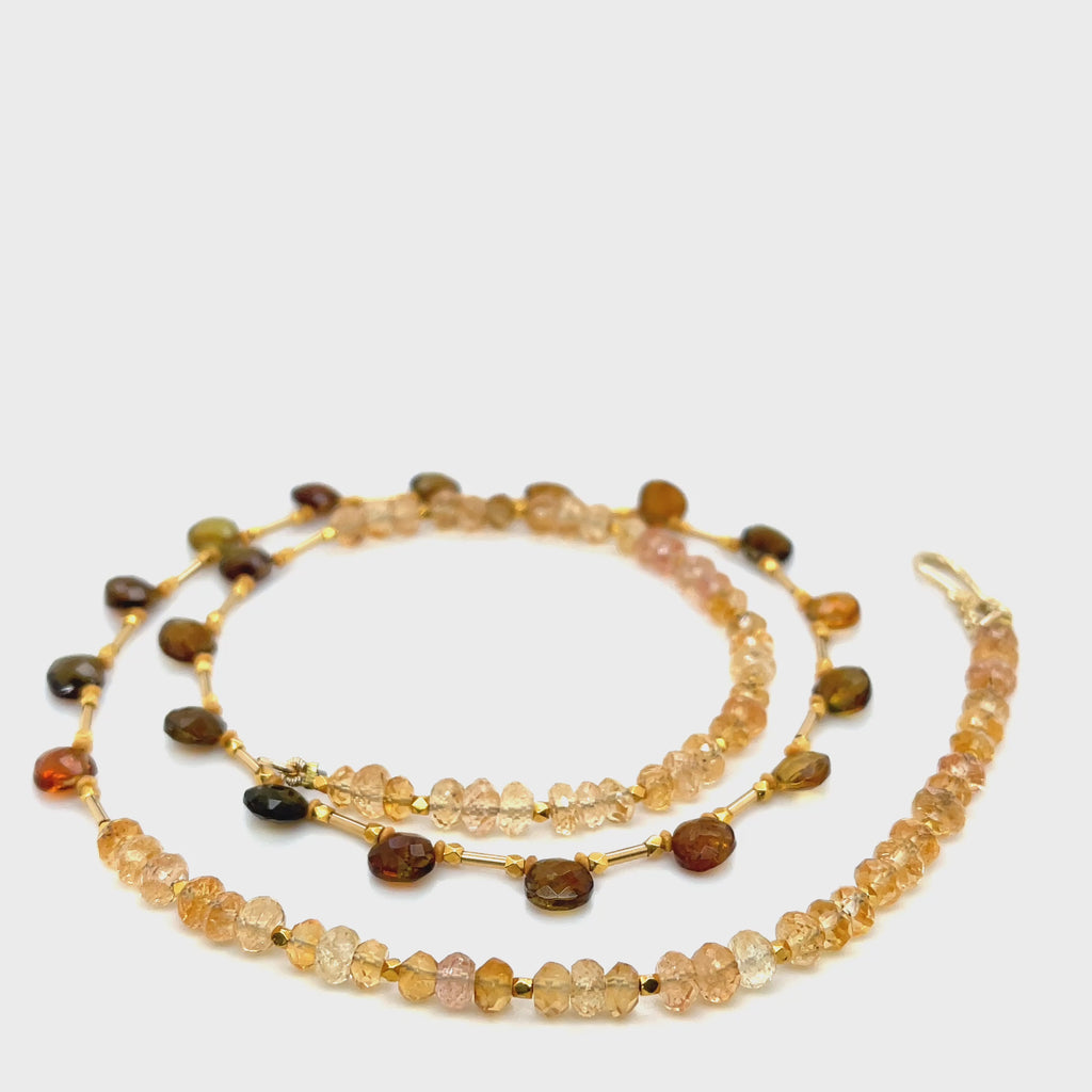 This pretty tourmaline and citrine necklace features a collection of pear-shaped tourmaline briolette beads and faceted citrine rondels, hand strung on silk thread with yellow gold accents. The green and amber colored tourmalines are complemented beautifully by the warm crystalline citrine and 14k yellow gold elongated barrel beads. Faceted 18k yellow gold cubical shaped beads add texture and rich pops of golden coloring that bring everything together beautifully. The 14k yellow gold hook clasp finishes the necklace at 18 inches - a perfect length for a variety of necklines! This necklace can be dressed up or down, worn alone, or layered for different looks. A fun and unique way to add variety and color to your wardrobe!