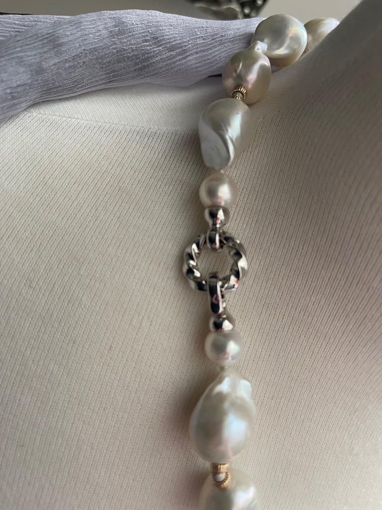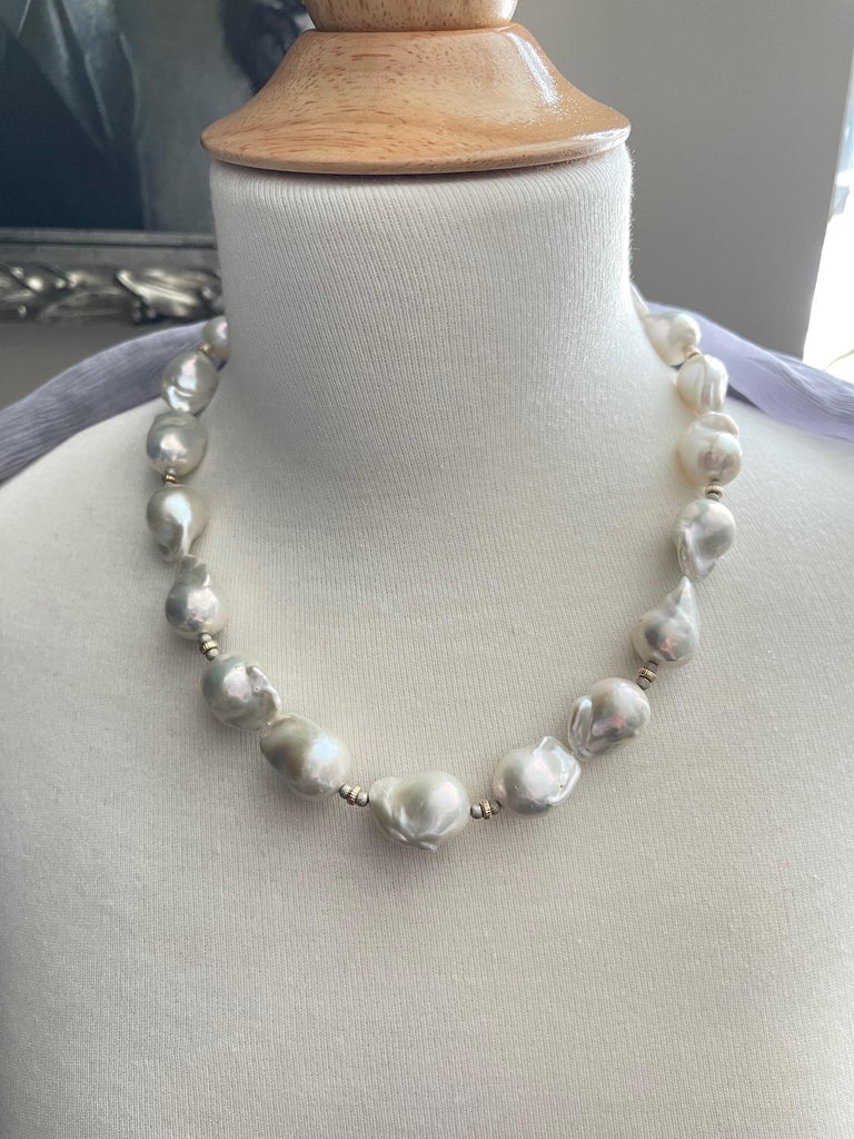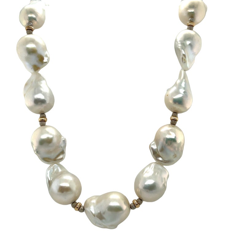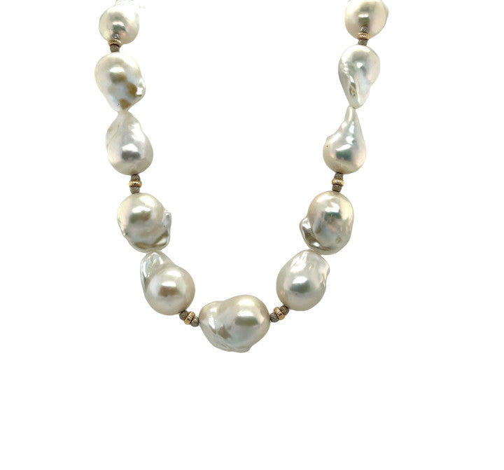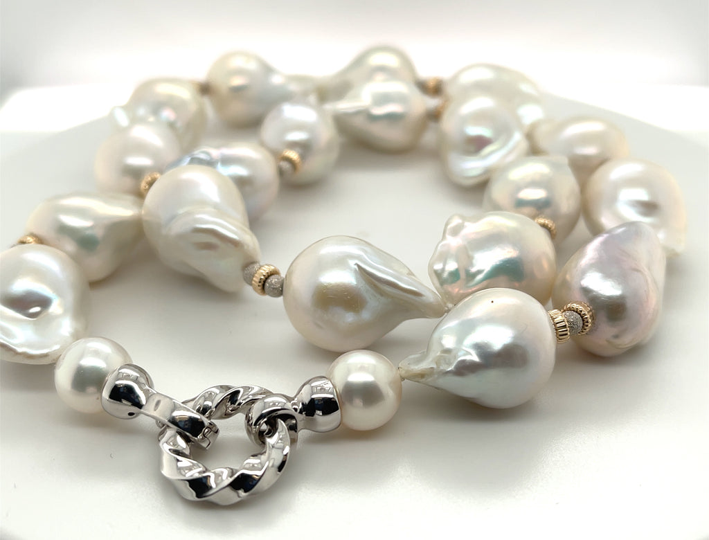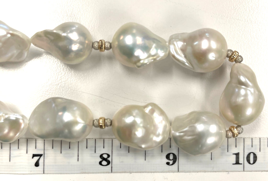 This impressive necklace features 19 large white baroque freshwater nucleated pearls ranging in size from 14 to 16mm! They have beautiful white and silvery-white pearlescence and have been hand strung on silk thread with 14k white and yellow gold spacers. A single 9.50mm round, white freshwater pearl accents each end, and the necklace has been finished with a beautiful white gold clasp. A contemporary look that will complement both your casual and dressy wardrobe, you can't go wrong with pearls!