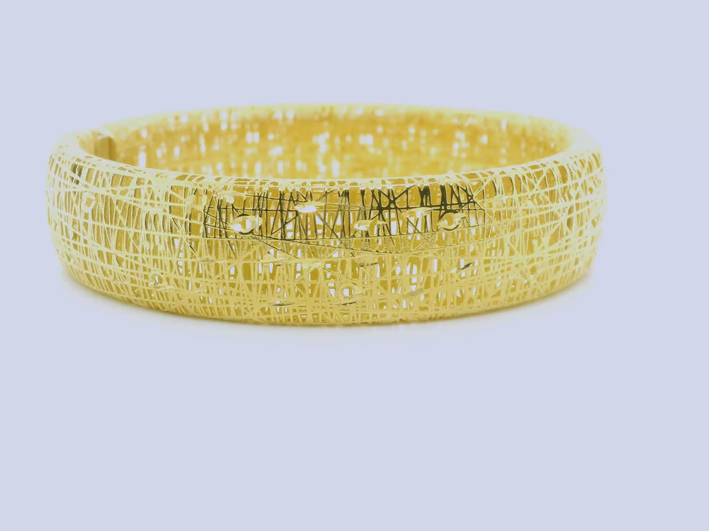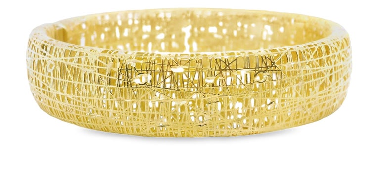 This wide bangle bracelet is absolutely stunning with its intricate open "nest" design that showcases gorgeous craftsmanship and artistic beauty. The bracelet measures 15.25mm wide (approximately 5/8") and is rounded on the sides, adding interest and style to this rich and luxurious look. A perfect bracelet for daytime or evening wear, it is wonderfully versatile and head-turning! Treat yourself to what will be your gorgeous new signature piece!