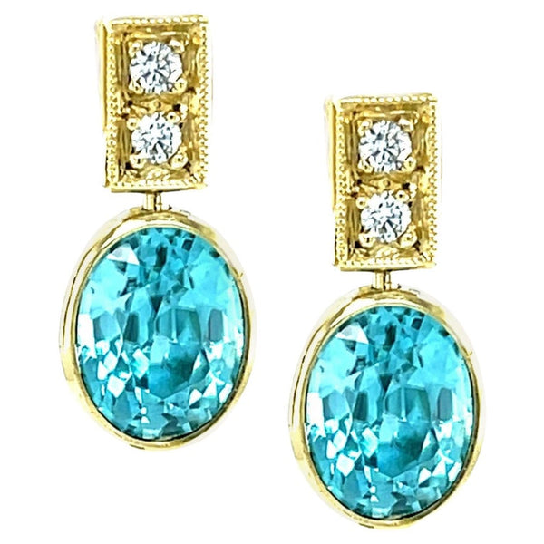 Blue Zircon and Diamond Drop Earrings in 18k Yellow Gold, 10.62 Carats Total