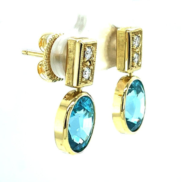2.64 Carat Total Blue Zircon and Diamond 18K Yellow Gold Dangle Earrings