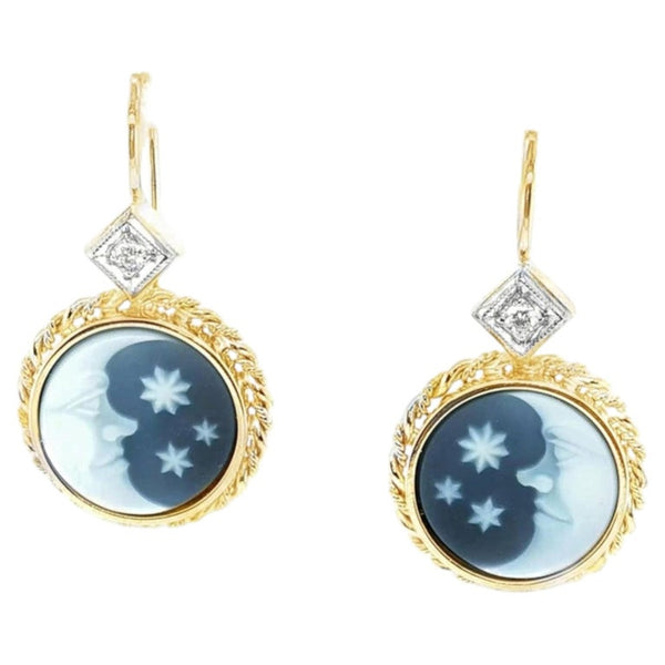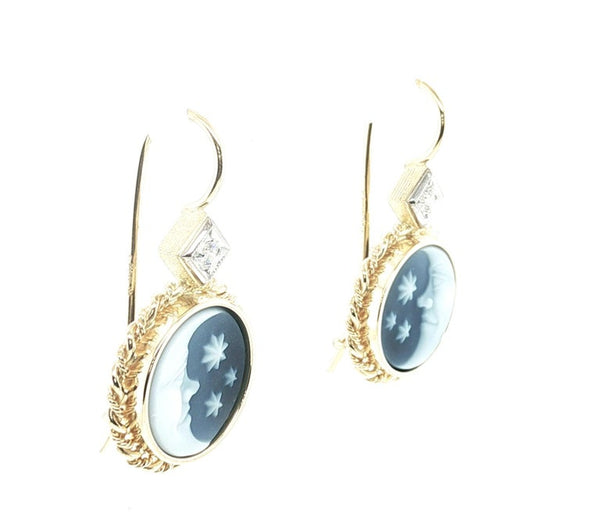 Hand Carved "Moon and Stars" Agate Cameo and Diamond Drop Earrings in 18k Gold