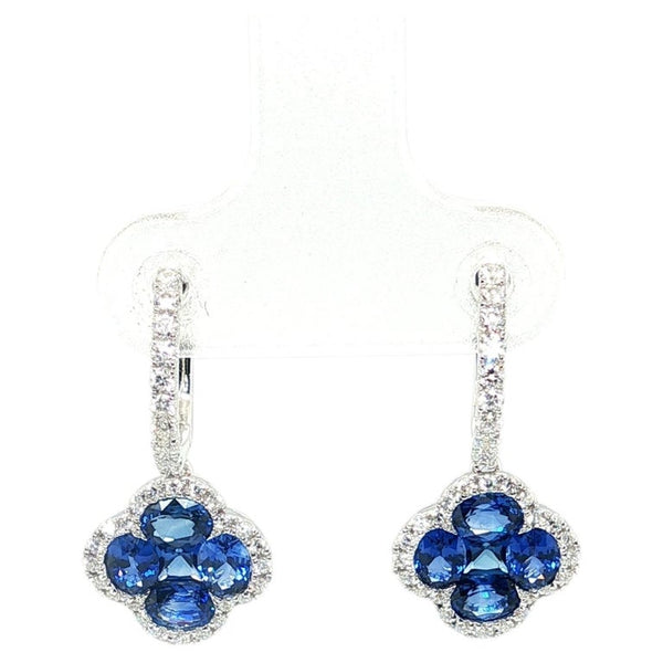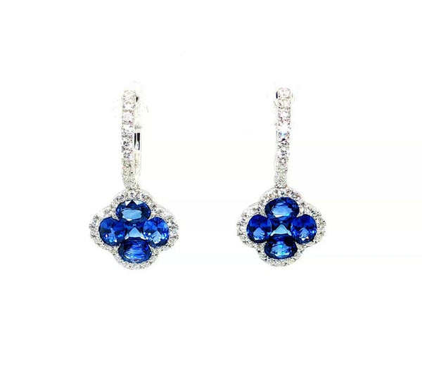 Blue Sapphire and Diamond Clover Dangle Earrings in 18k White Gold