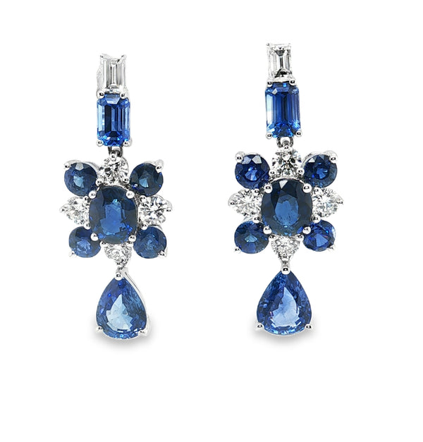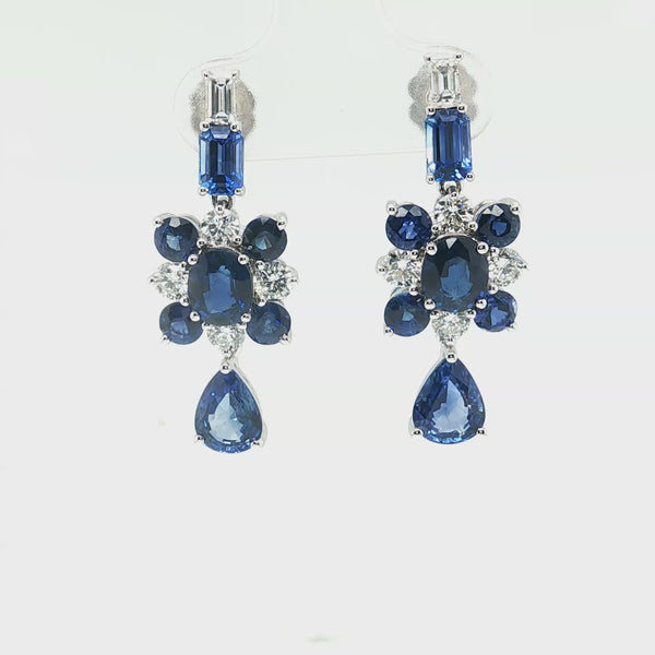 7.32 Carats Total Blue Sapphire and Diamond Dangle Earrings in 18k White Gold