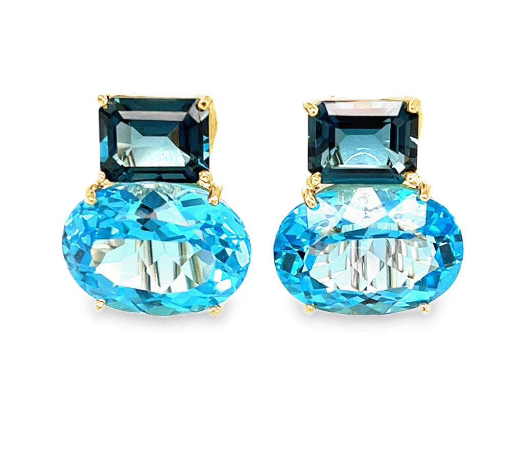 These French clip earrings feature over 28 carats of stunning Swiss blue and London blue topaz set in handcrafted 18k yellow gold earrings. The richly colored emerald-cut London blue topaz weigh 5.30 carats total and are set horizontally above large, bright Swiss blue topaz ovals that weigh 23.19 carats combined. The two shades of blue are striking next to each other in these earrings that will complement both daytime casual and dressy evening wear beautifully. One-of-a-kind earrings made by our Master Jewelers in Los Angeles. An elegant way to add color to your fine jewelry wardrobe!