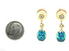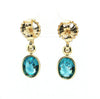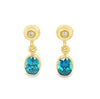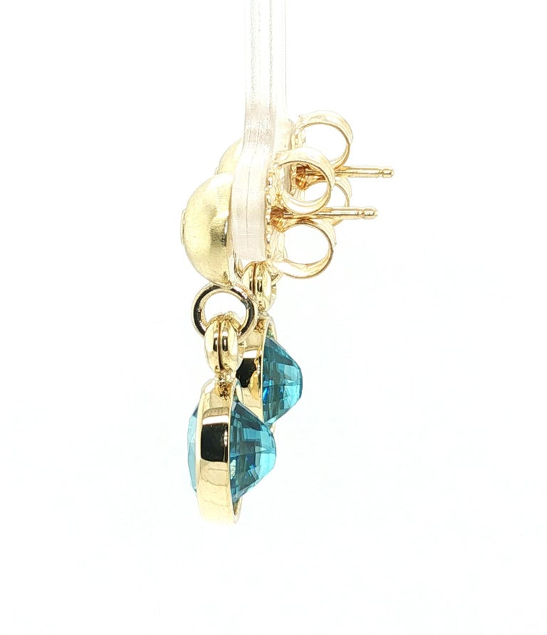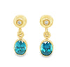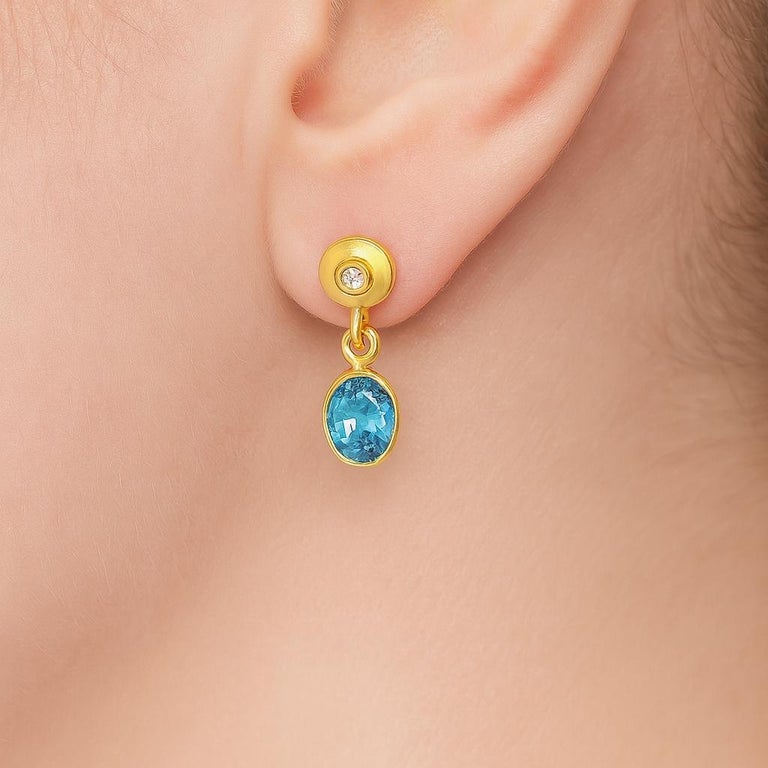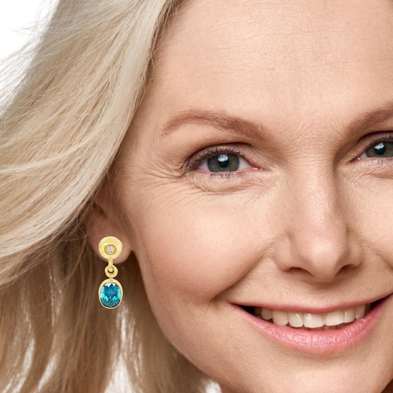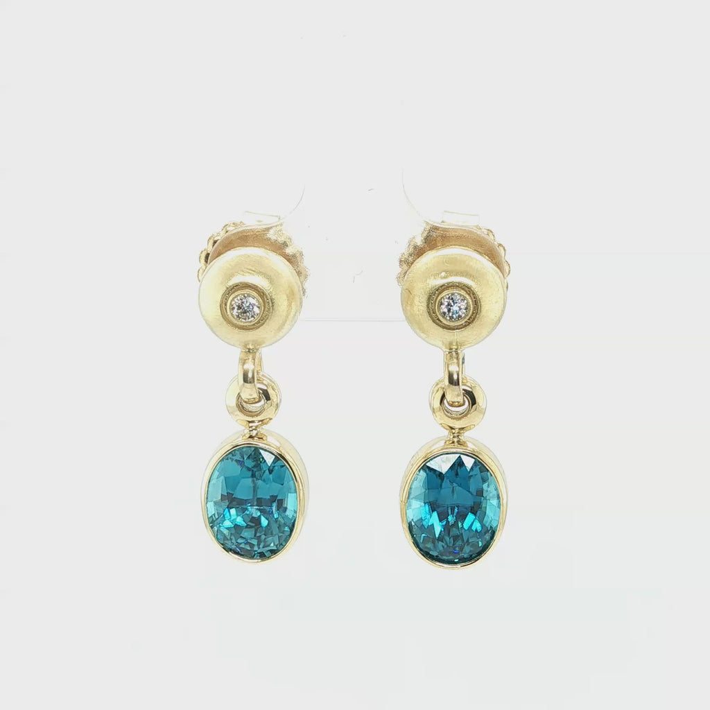 These stunning drop earrings feature over 10 carats of gorgeous blue zircon gems set with sparkling diamonds in 18k yellow gold. The oval blue zircons are impressive enough to be center stones in rings, so this beautifully matched pair is truly a sight to behold. With their vibrant, electric blue color, these are stunning gems that are exceptionally well-cut to showcase the zircons' characteristic brilliance. They have been bezel set by hand in custom-made settings and dangle from "puffed" satin-finished tops set with fine, brilliant-cut natural white diamonds. The earrings have beautiful movement and they are perfect for both daytime wear and elegant evenings. The earrings measure 1-1/16" in length and have 18k posts with luxurious oversized "monster" backs for extra comfort. Handcrafted by our Master Jewelers in Los Angeles, these beauties will make a head turning addition to your fine jewelry wardrobe!