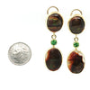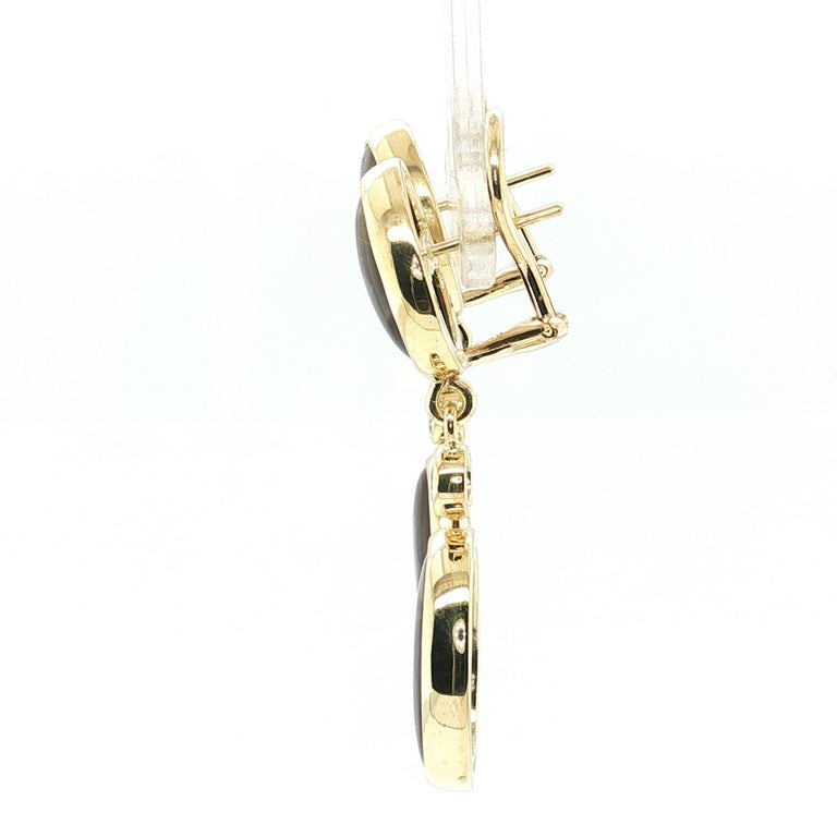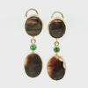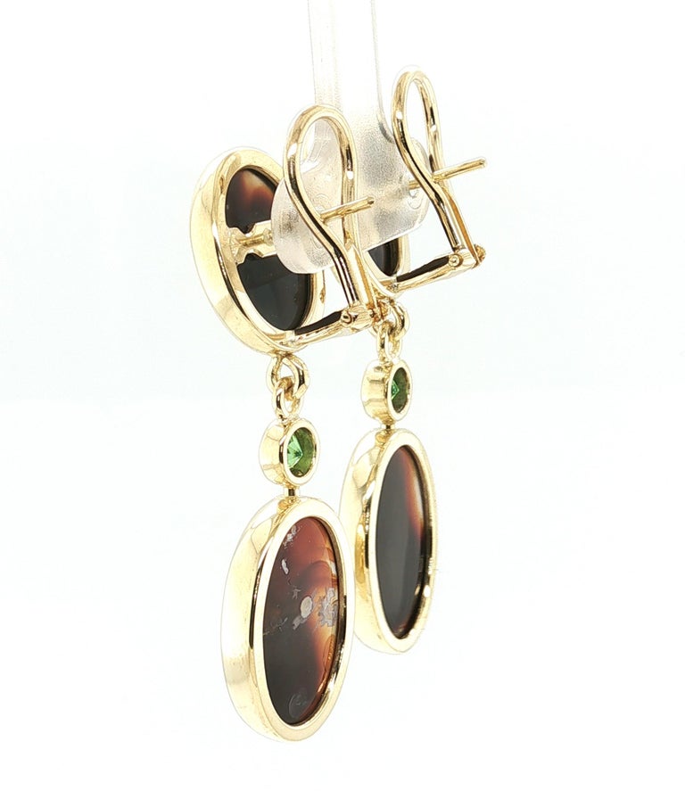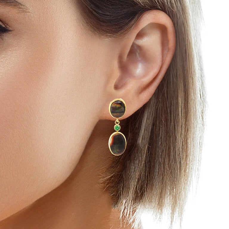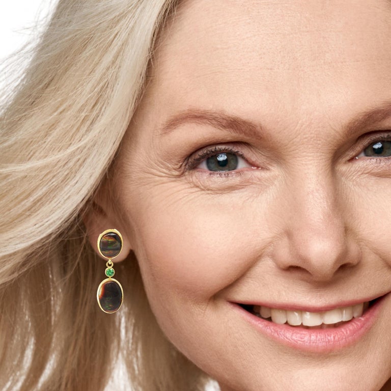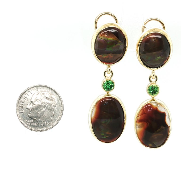 These stunning dangle earrings feature beautiful fire agate cabochons set with bright tsavorite green garnets in 18k yellow gold handmade bezels. The fire agates display gorgeous rainbow iridescence, seeming to bubble over with prominent green and orange against their rich coffee-hued body color. The flowing bands of color give the earrings such a dramatic feel and appearance as they dangle below the ear! Handcrafted in 18k yellow gold by our Master Jewelers in Los Angeles, the earrings measure 1-7/8" long and have posts with 18k yellow French clip backs for added comfort. A beautifully original way to add color and interest to your jewelry wardrobe!