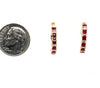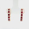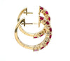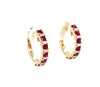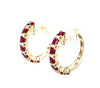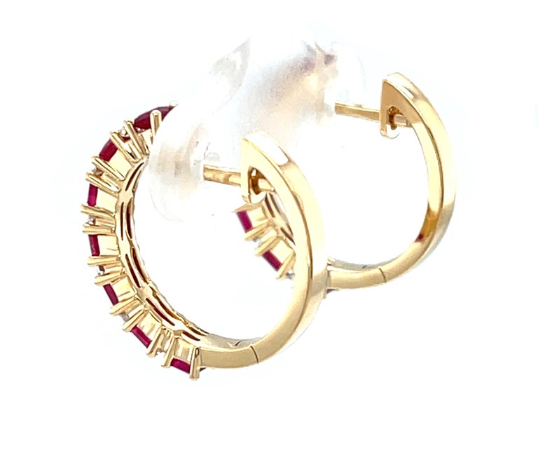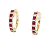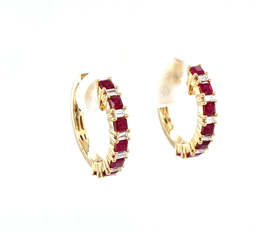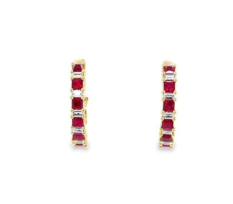 These beautiful hoop earrings feature gorgeous princess-cut rubies and fine, natural diamond baguettes set in 18k yellow gold hoops that are perfect for both daytime and evening wear. The rubies have bright, vivid red color with rich pinkish highlights characteristic of fine rubies. Petite in size yet impressive in appearance, the red gems stand out beautifully with the white diamond baguettes set horizontally between them. The earrings measure approximately 11/16th inch in length and are hinged with a secure snap enclosure. A perfect way to add color and elegance to your wardrobe!