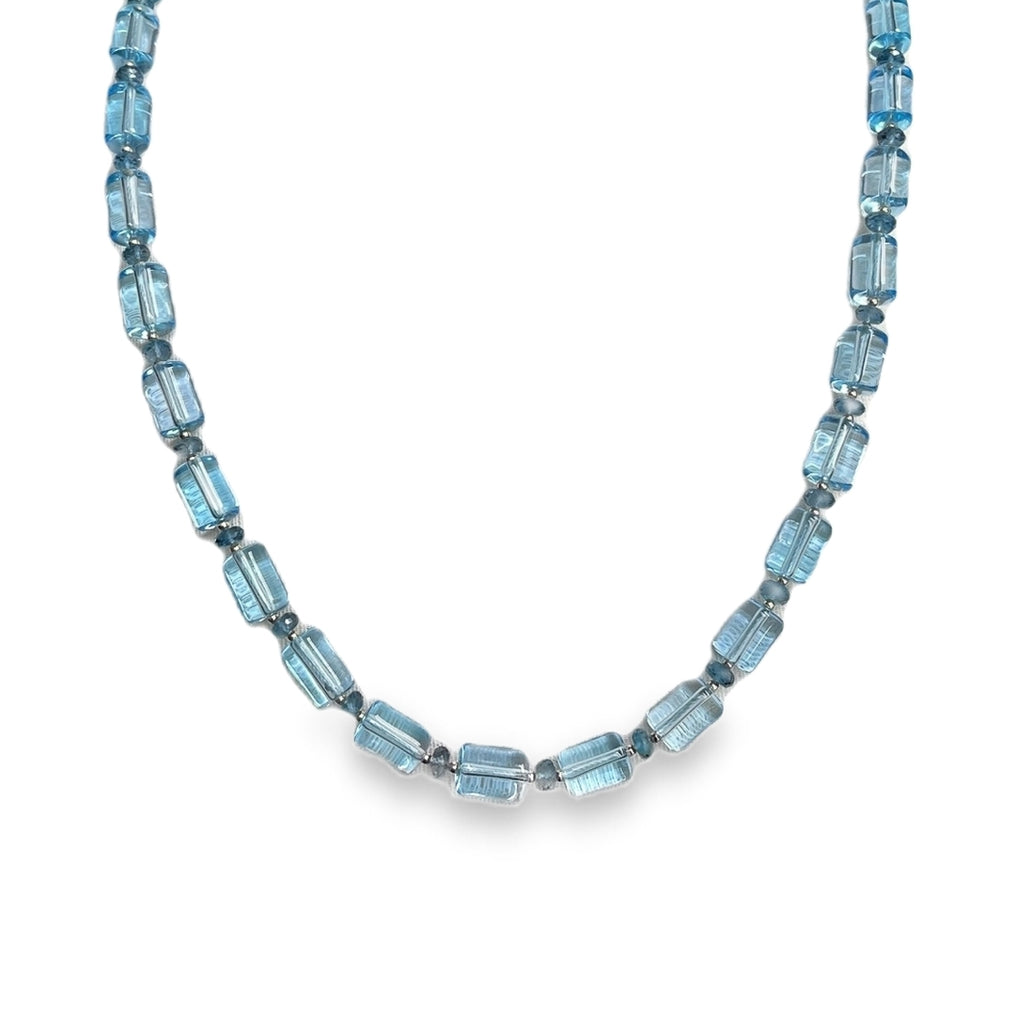This beautifully attractive blue topaz necklace features bright Swiss blue topaz tubular beads paired with rich faceted London Blue topaz and 14k yellow gold accents. The Swiss blue topaz beads have bright crystal blue color and measure 7/16" in length. London blue topaz rondels provide striking pops of color that are highlighted by petite 14k yellow gold beads and the striking, elongated 14k yellow gold clasp. Wonderfully versatile for everyday and special occasions, the longer 23.5 inch length is easy to layer with other pieces and perfect for everything from summer dresses to winter turtlenecks! A beautiful addition for your fine jewelry wardrobe!