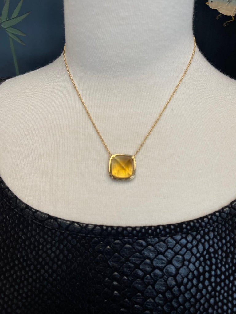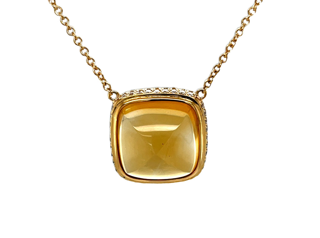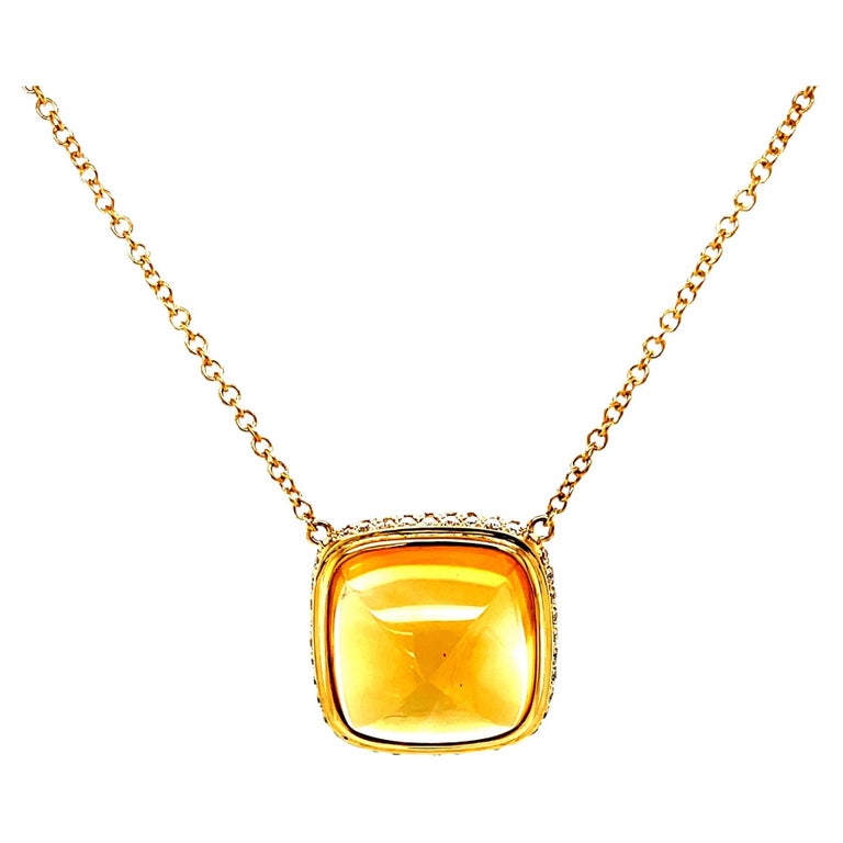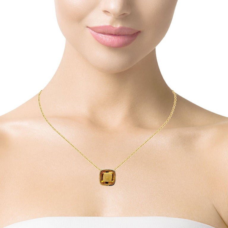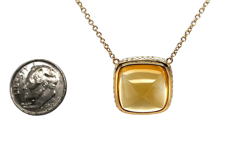 This beautiful necklace can be worn with anything, given its "gold on gold" colorway. It features a gorgeous 16.79 carat citrine square "sugarloaf" cabochon, whose rounded "sides" give the gemstone beautiful added dimension. The citrine is set in an exquisite, handmade 18k yellow bezel and is framed by a row of brilliant white diamonds. A second frame of pave set sparkling yellow sapphires echo the citrine's golden color and make this pendant stunning from all angles! The pendant measures 3/4" in diameter and is attached to an 18k yellow gold chain that can be worn at 16, 16.75 and 17 inches. Clasp has an additional gold plaque that has been beautifully engraved with the weights of the gems and "750" (18k). Perfect for both everyday and special occasions!