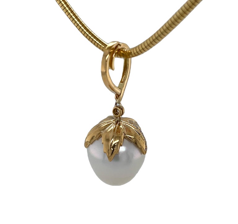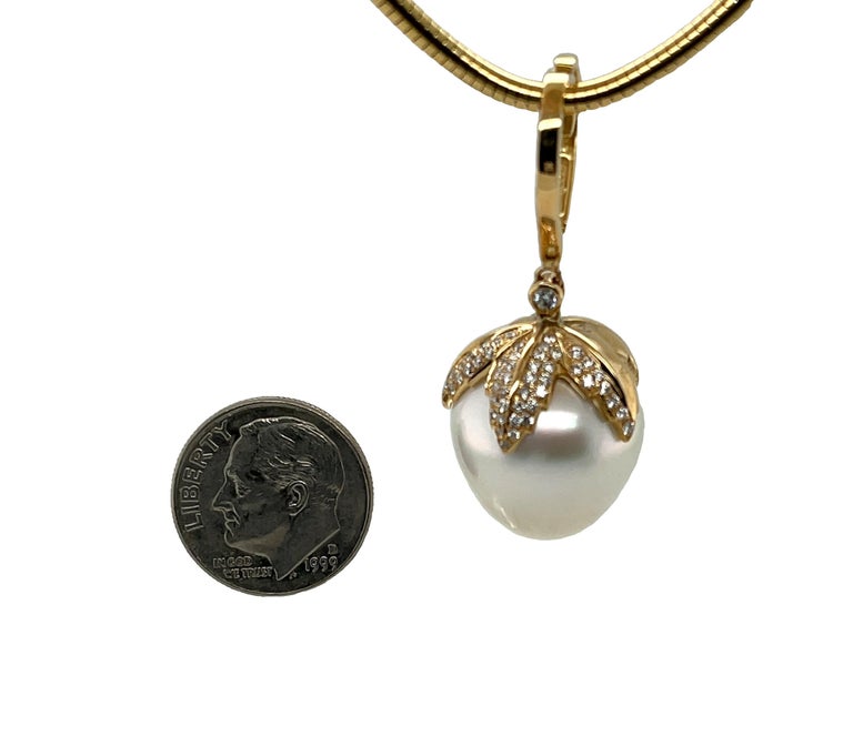 This gorgeous necklace pairs an impressive, diamond-studded South Sea pearl and yellow gold pendant with a 48-inch double strand of 3mm Akoya saltwater pearls! The pendant features a very large 16mm South Sea pearl with shiny white luster attached to an 18k yellow gold leaf-design "cap." The cap is pave set with sparkling white diamonds and topped with a bezel-set single round brilliant diamond. A beautiful hinged yellow gold enhancer bail clips securely over the double strand of petite cultured Akoya pearls and can be worn with other strands of pearls, beads, or a gold chain! The pearls in this necklace can also be doubled to create a shorter necklace. These can be worn day or night and dressed up or down - so many different looks - modern, classic, casual, dressy, and truly timeless!