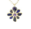 This gorgeous handmade pendant features eight impressive boulder opals, beautifully arranged around a bright, 5.48 carat round amethyst! The opals have stunning electric royal blue and purplish blue hues that stand out against rich, coffee-colored matrix. Lovely hints of turquoise and lavender add bright highlights and complement the pinkish purple color of the central amethyst. Each gem is set a striking 18k yellow gold bezel and frame, handcrafted by our Master Jewelers in Los Angeles. An exquisitely hand-textured bail finishes this stunning, one-of-a-kind statement piece that is sure to turn heads! Handmade 18k yellow gold chain sold separately.