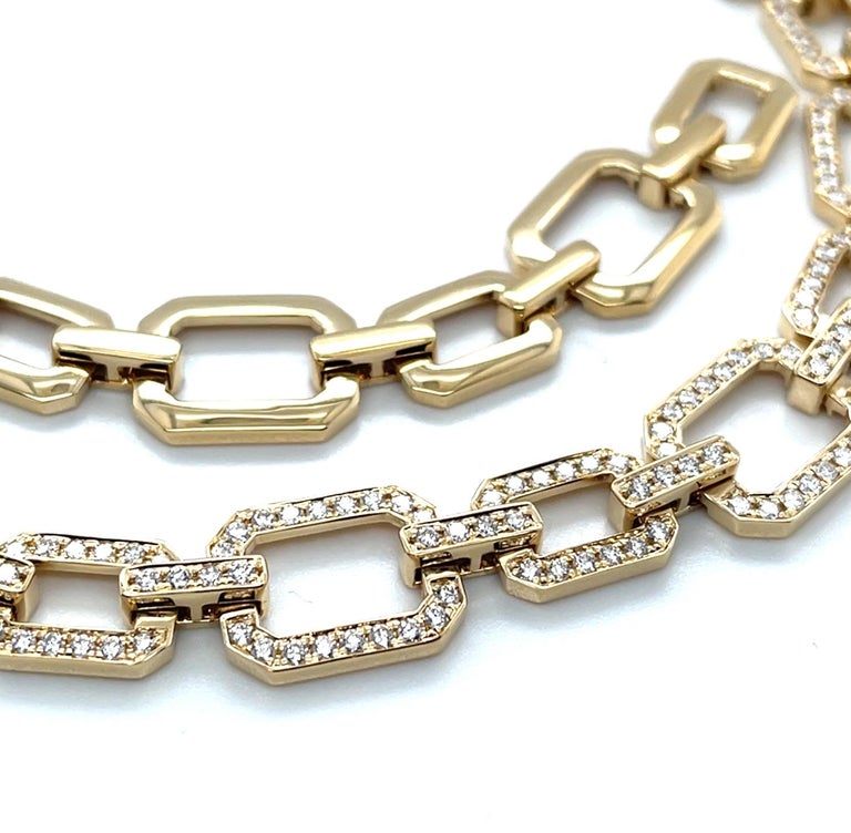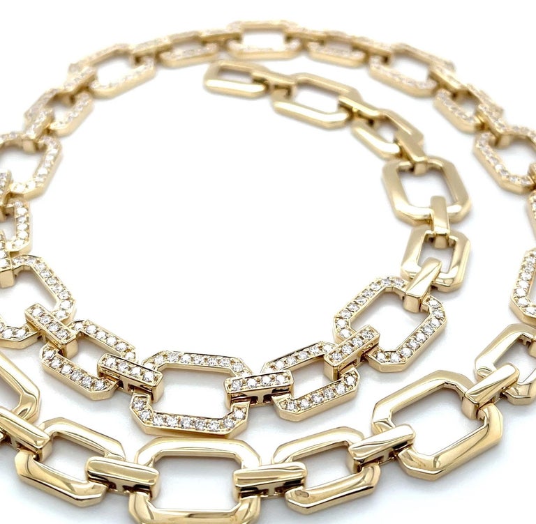 This stunning diamond and 18k yellow gold link necklace is gorgeous to look at and so comfortable to wear! Set with over 5 carats of sparkling white diamonds, the modern, open links in this design make this a wonderfully versatile "signature" piece that is perfect for both daytime and evening wear. The largest links measure 5/8 x 1/2", while the smaller links measure 1/2 x 3/8". The 18k yellow gold hidden link closure snaps securely and brings the necklace to a finished length of 18 inches to complement a variety of necklines. What a perfectly elegant way to add style, sophistication to any outfit!
