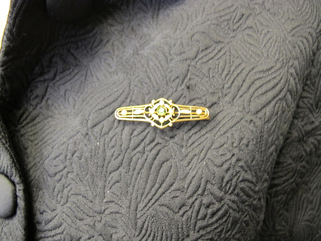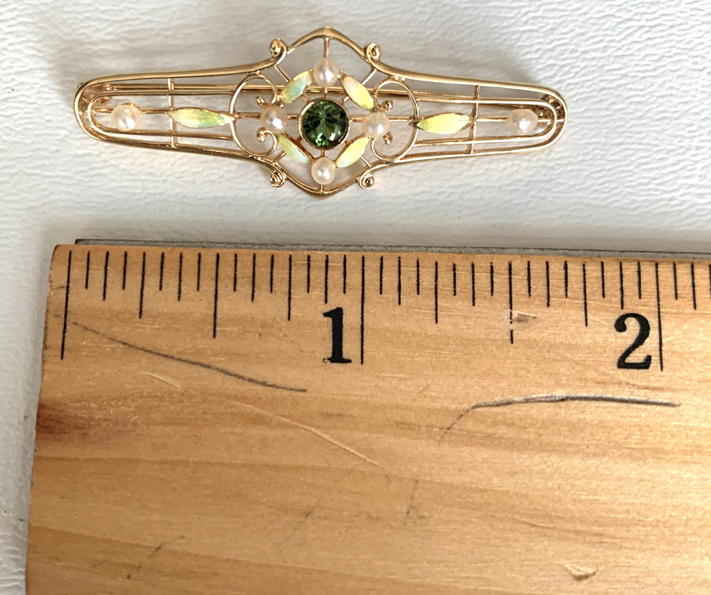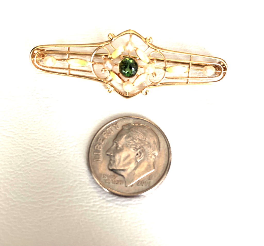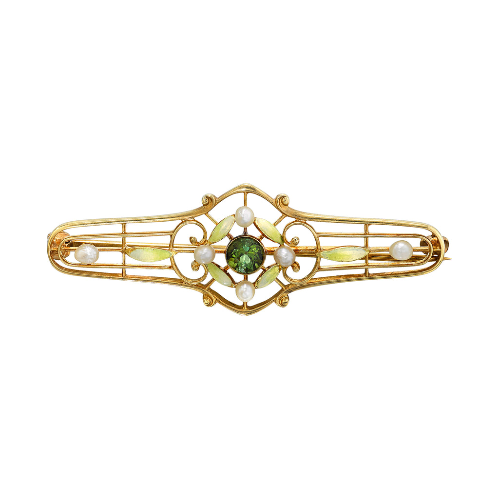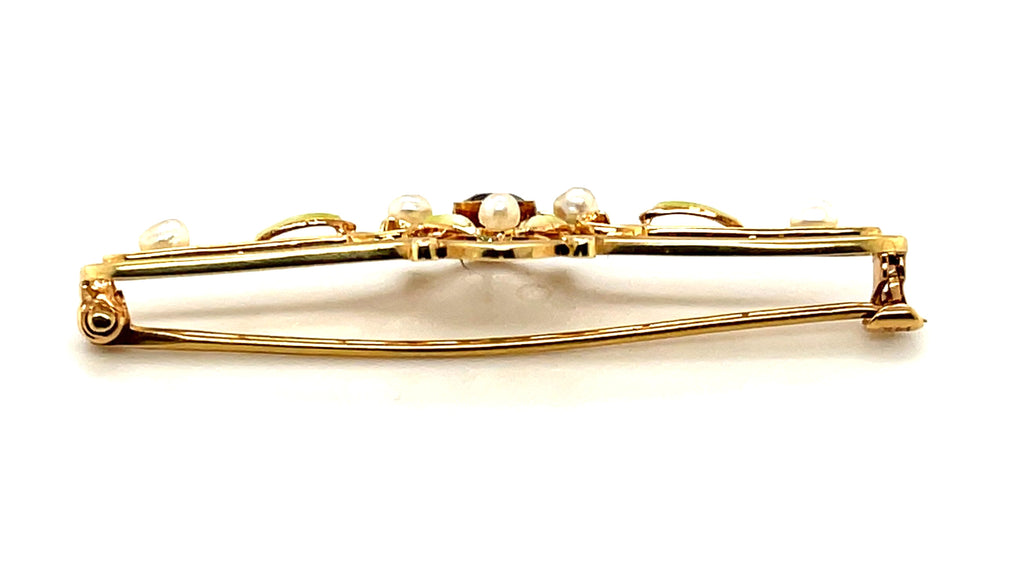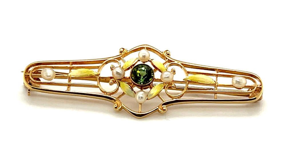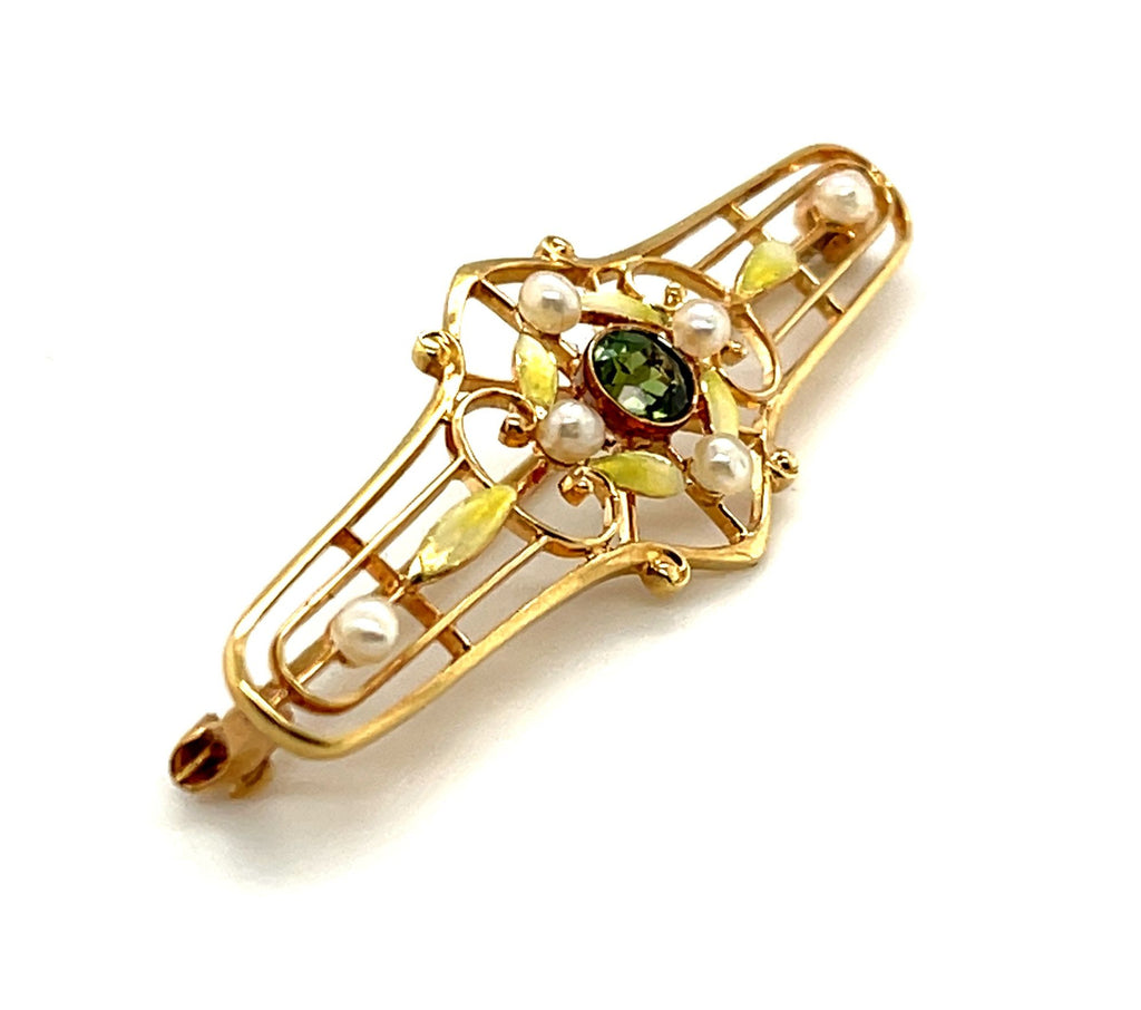 This beautiful 14k yellow gold Art Nouveau inspired pin features a very rare demantoid garnet, the rarest of all garnets. Displaying its characteristic green hue and brilliant fire, the 4.4mm demantoid garnet is framed by six 2mm white pearls and elegant marquise-shaped porcelain enamel accents. A timeless and stylish accessory for any outfit!