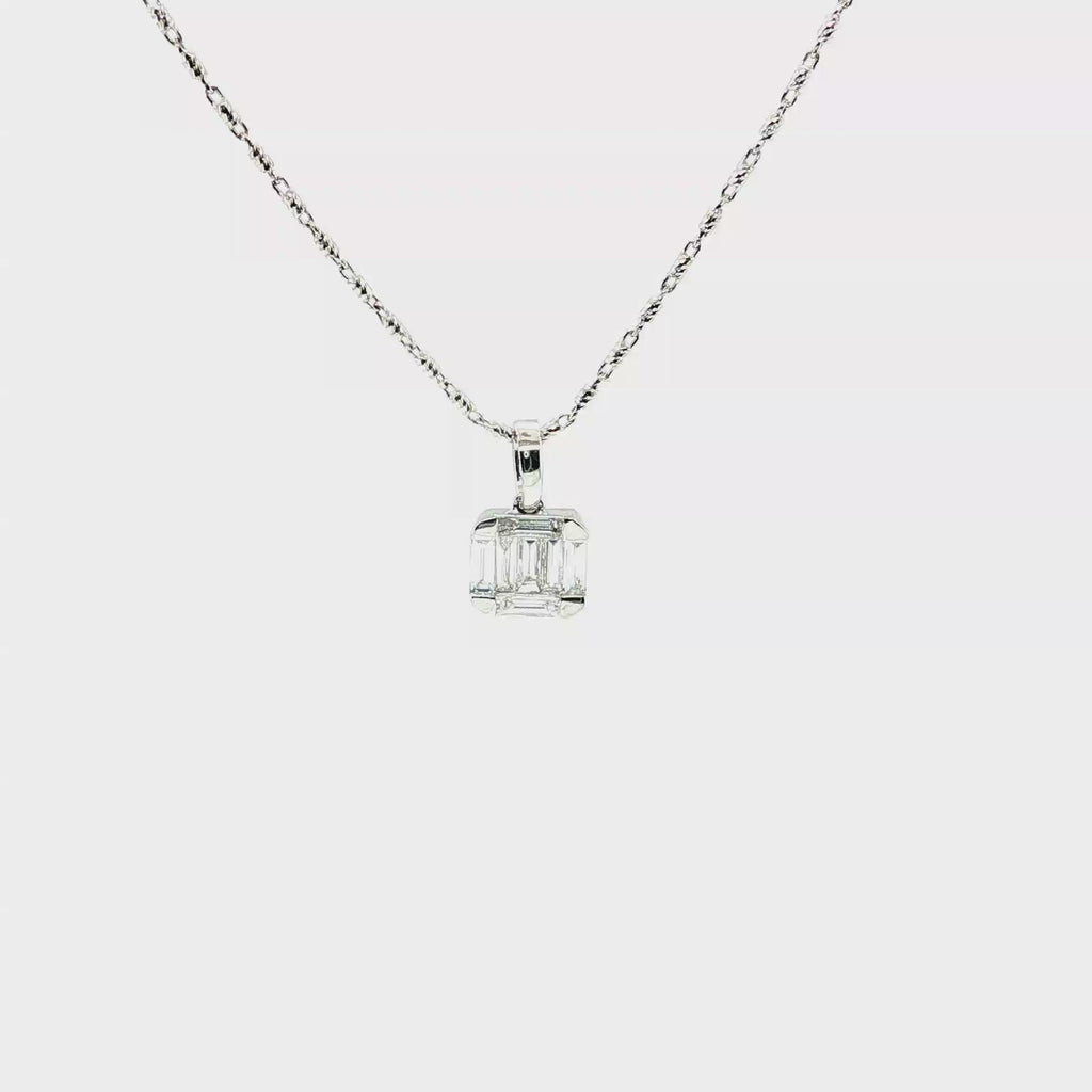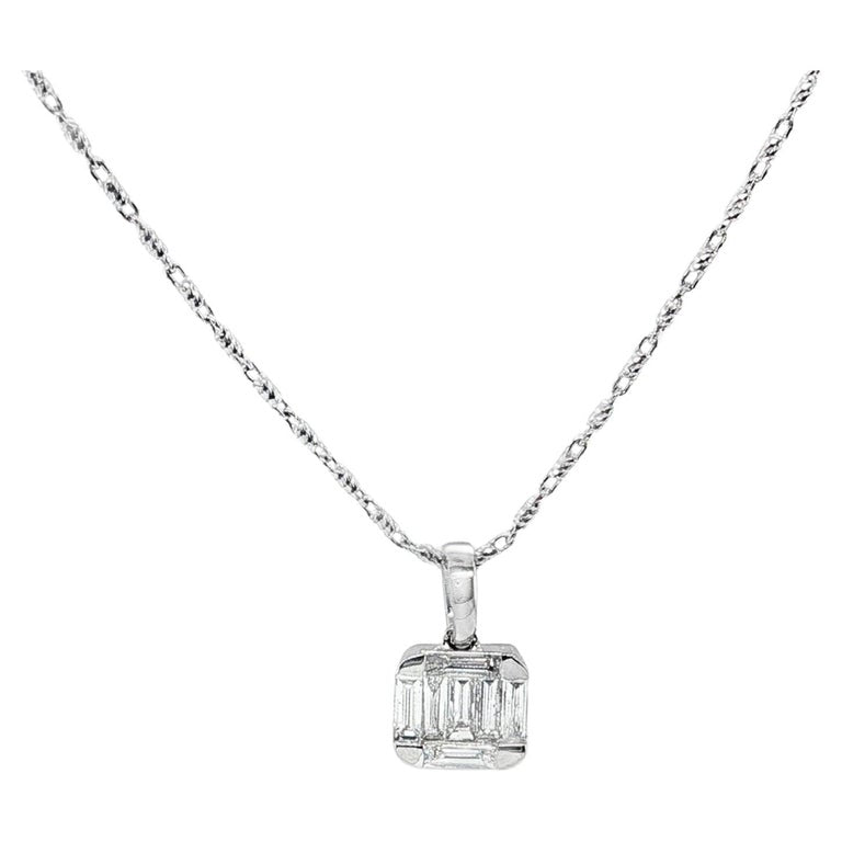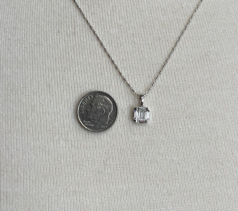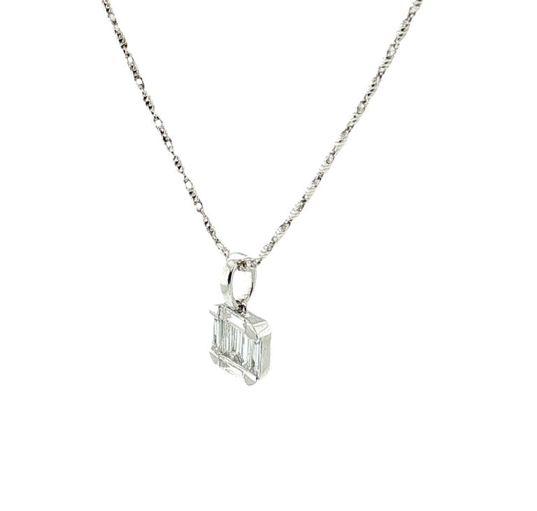 This elegant pendant necklace features a lovely arrangement of straight baguette-cut, natural white diamonds set in 18k white gold with an included 18k white gold chain. The diamonds are beautifully arranged in what is called an "illusion" setting because at first glance the diamonds appear to be a larger single diamond! The overall square cushion shape of the pendant is a pretty update to the classic round. The pendant measures approximately 1/4" in diameter, and the included chain measures 18 inches in length. A timeless and elegant finishing touch for daytime wear and special occasions!