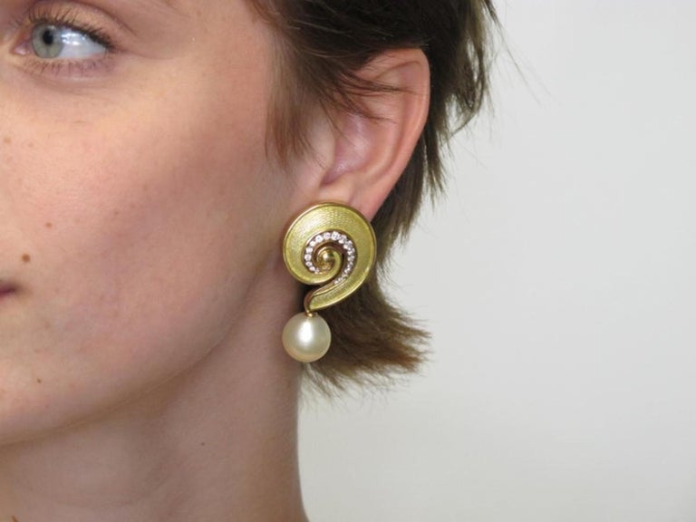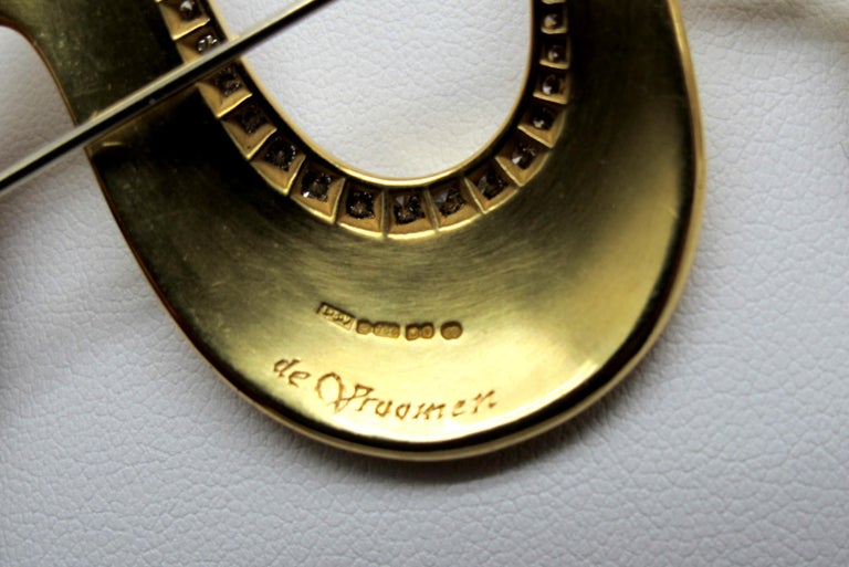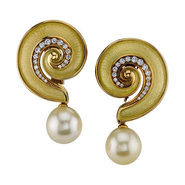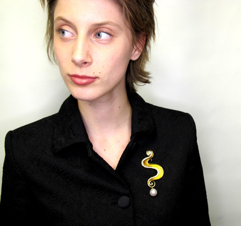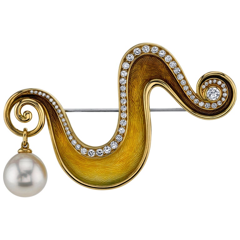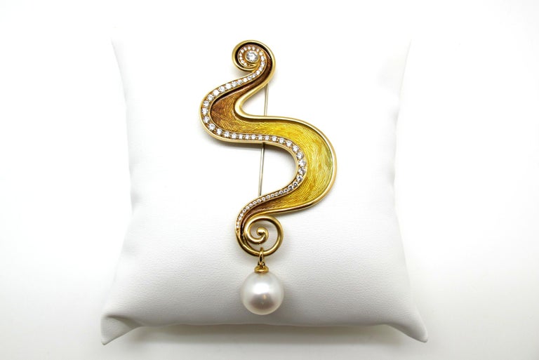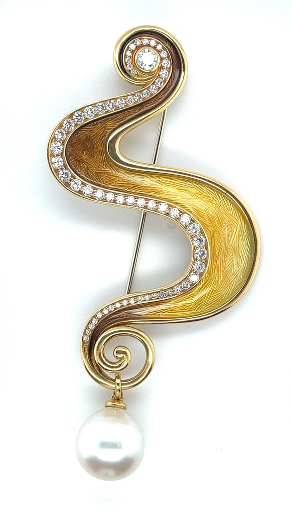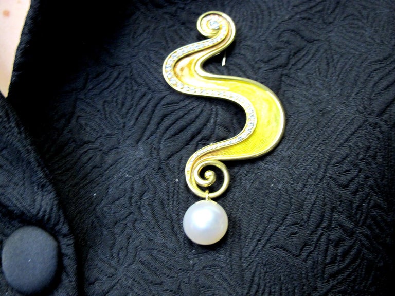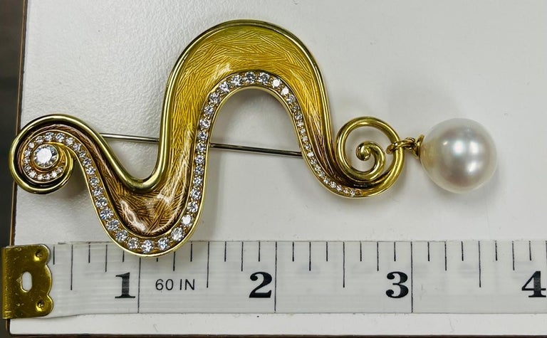 This beautiful enamel pin was made by Leo de Vrooman. He is an incredible designer who is known for exquisite enamel work. The pin is large and bold, measuring approximately 2-3/4" x 1-3/4". It is set with brilliant cut diamonds totaling approximately 1.20 carats. A 13 millimeter pearl completes the piece. Signed de Vrooman.