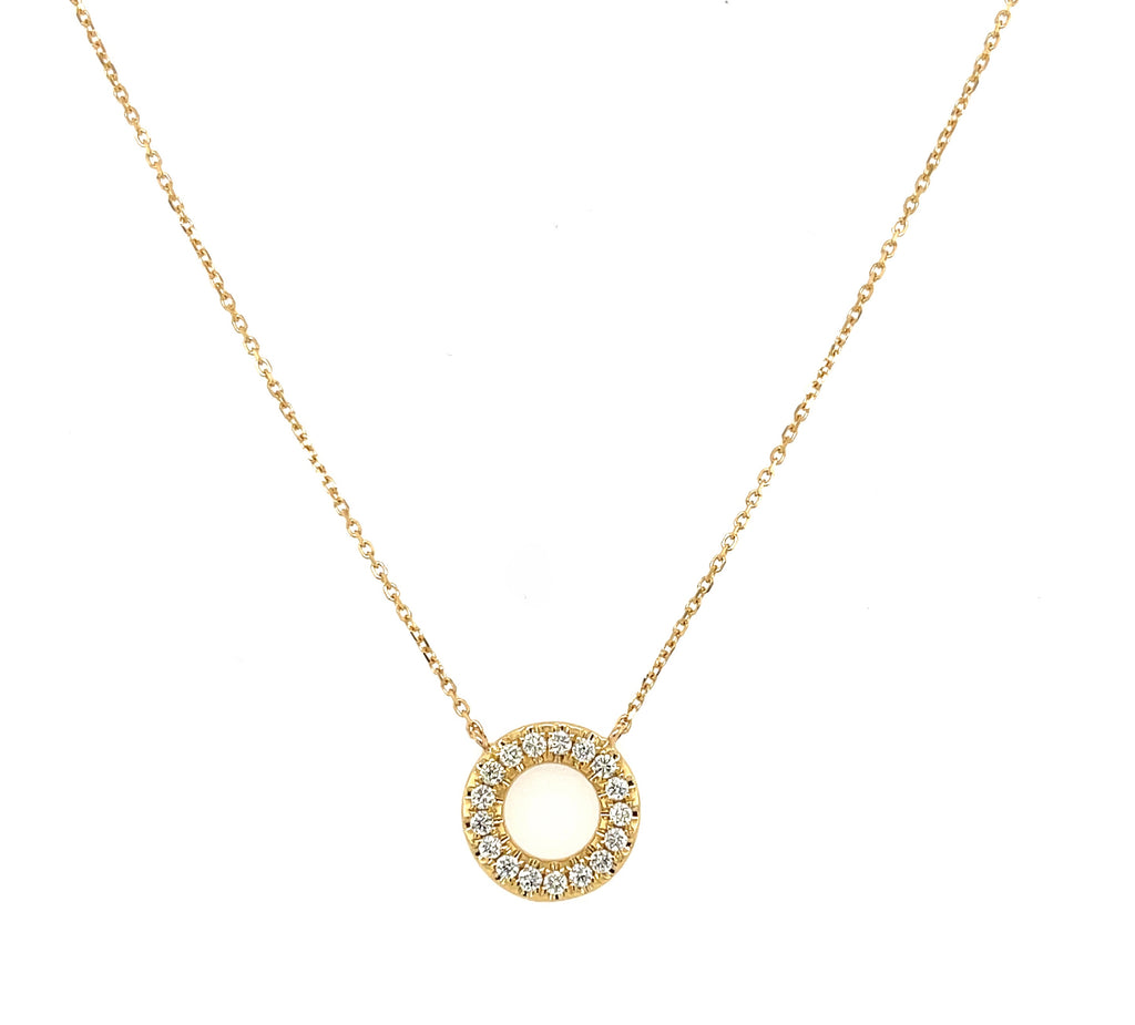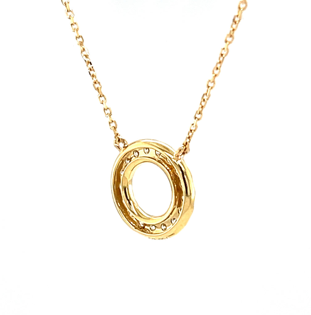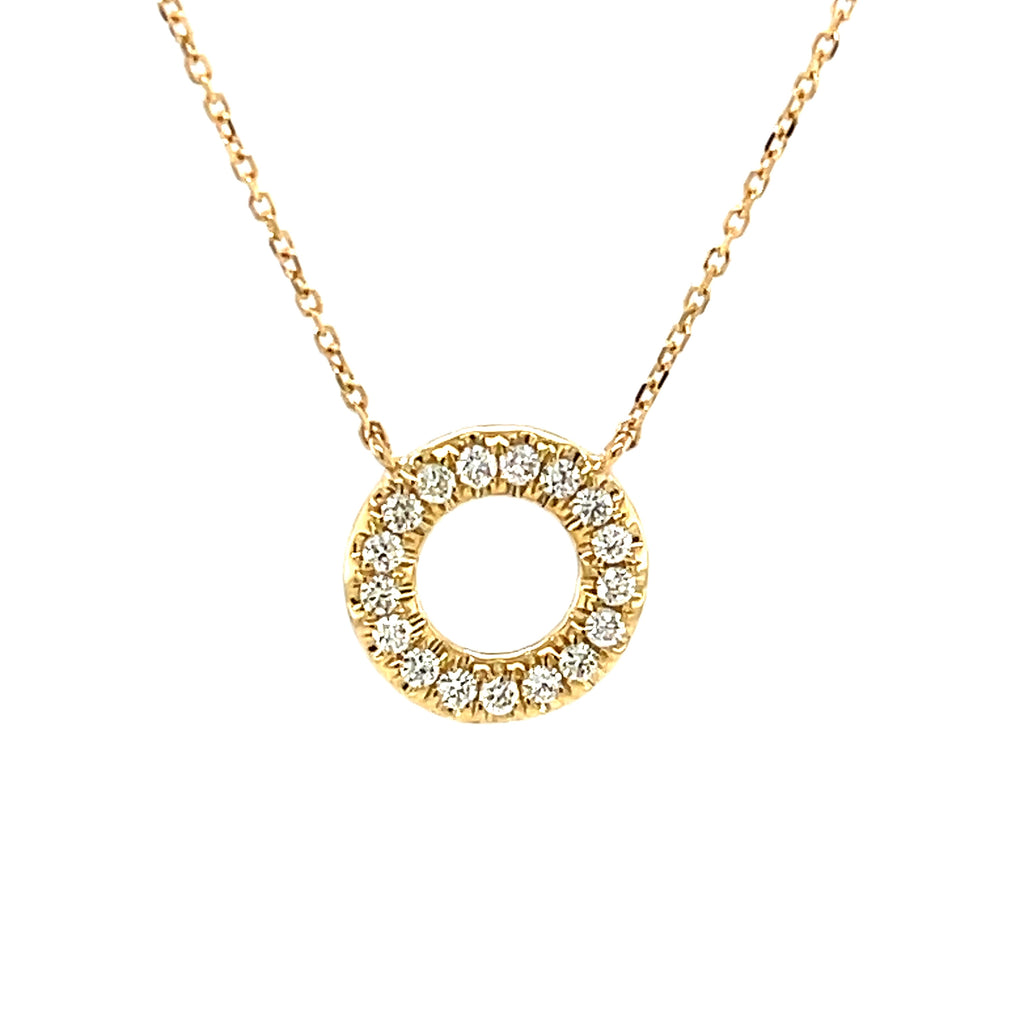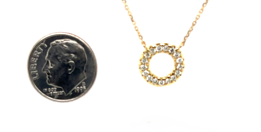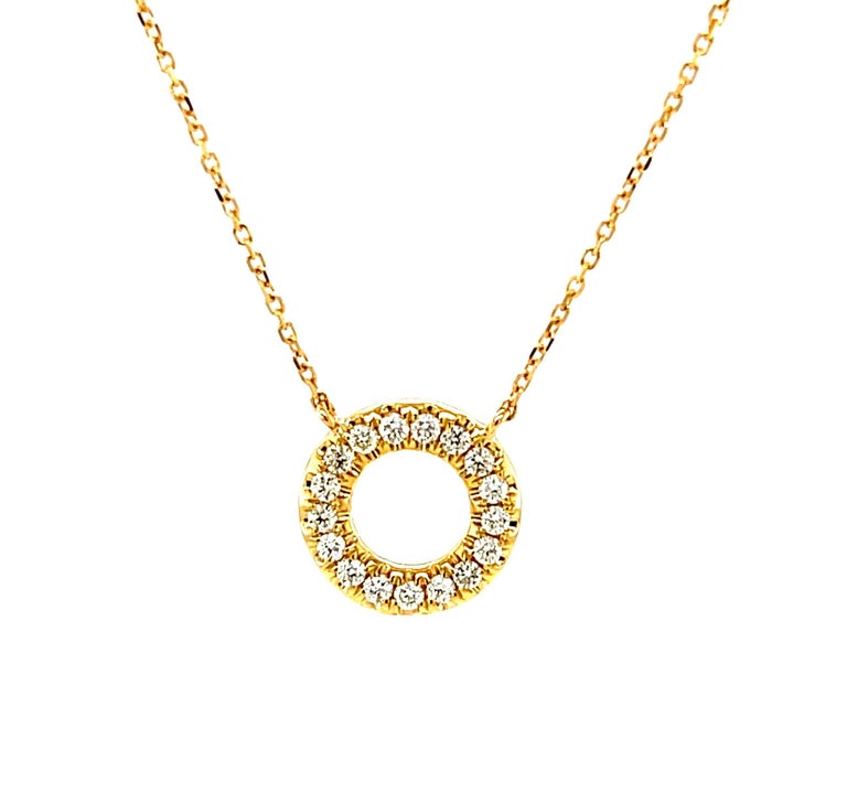This lovely diamond and gold necklace is perfect for everyday wear and special occasions alike! Just over a quarter of a carat of sparkling brilliant-cut diamonds are pave set in an 18k yellow gold circle symbolizing eternity and everlasting love. The diamond circle measures 7/16" in diameter and is attached to an 18k yellow gold link chain. Measuring 17 inches in length, this necklace is a beautifully elegant way to add a touch of luxury to your wardrobe!
