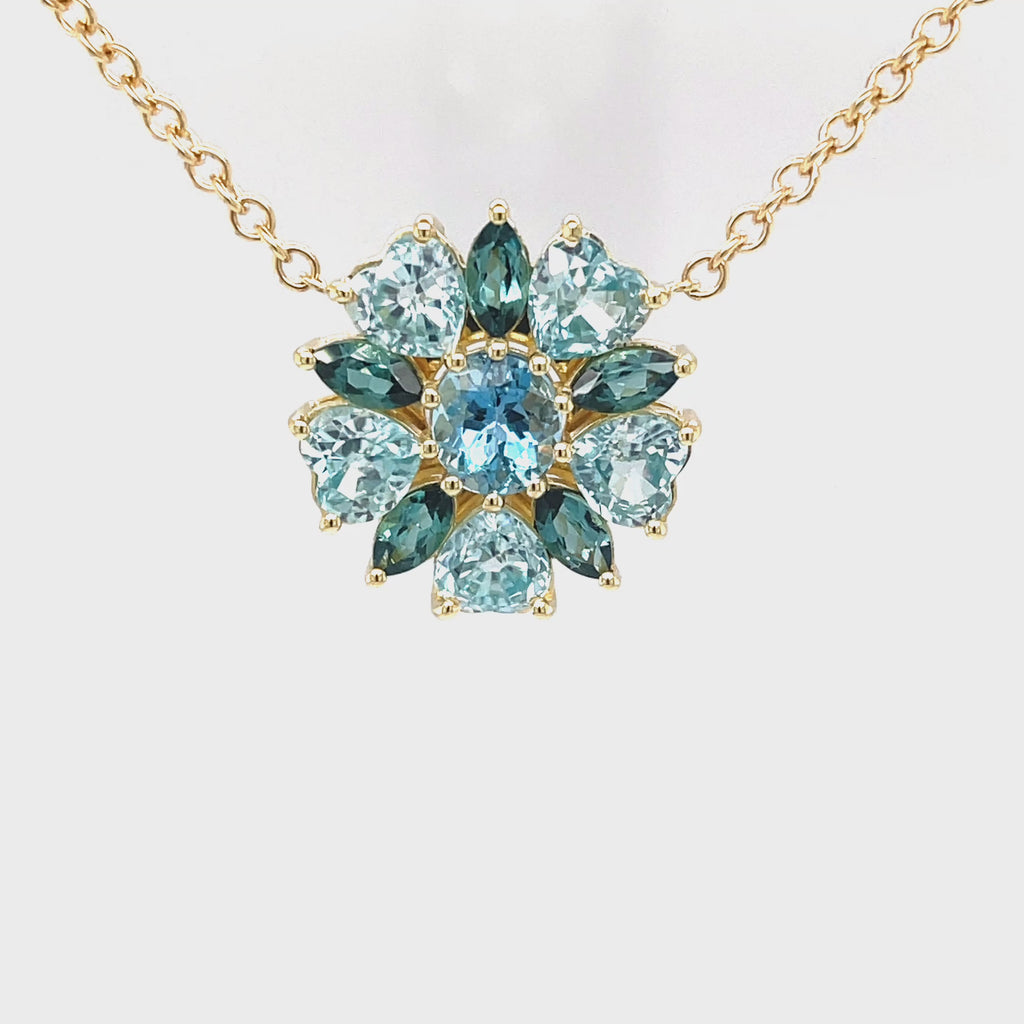 This stunning pendant necklace features a gorgeous Santa Maria mine aquamarine framed with heart-shaped blue zircon and marquise-cut London blue topaz in a one-of-a-kind, handcrafted 18k yellow gold setting. Santa Maria mine aquamarine is considered the finest in the world, recognizable by its telltale deep blue color. Heart-shaped blue zircons with their extraordinary brilliance frame the center gem and give the pendant its original outline and shape, while rich London blue topazes add eye-catching, vivid pops of color! The pendant measures 7/8" in diameter and is attached to a classic 18k yellow gold cable chain, bringing this necklace to a finished length of 18.5 inches. This necklace brings exciting color to any outfit and transitions easily between daytime and evening wear! Handcrafted by our Master Jewelers in Los Angeles, it is a beautifully original addition to any fine jewelry wardrobe!