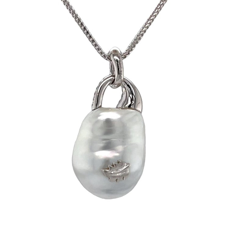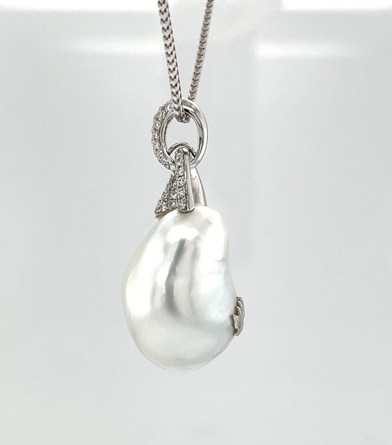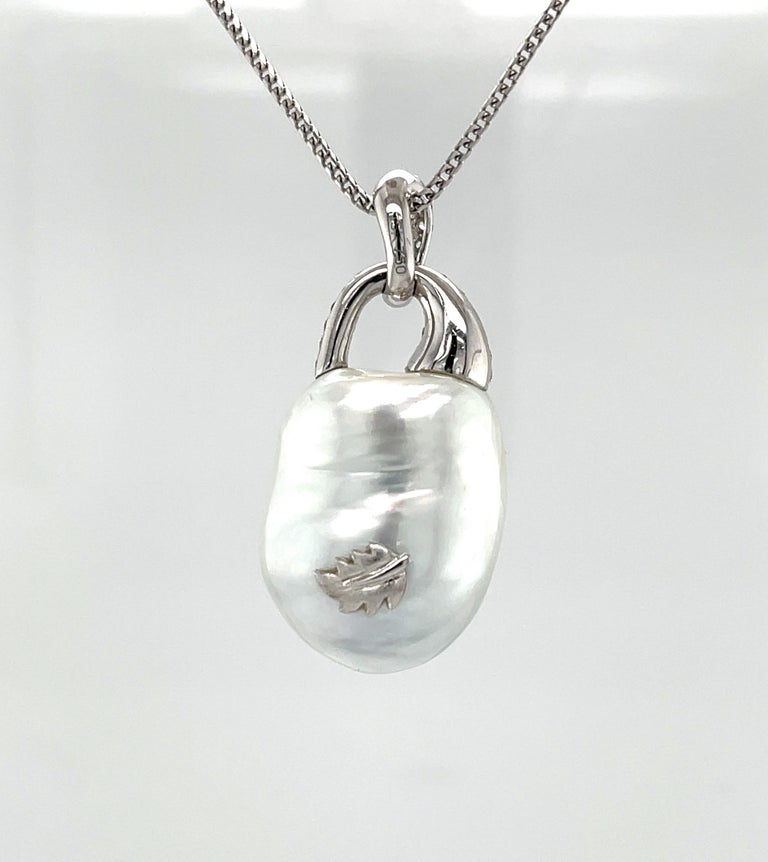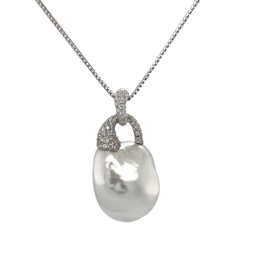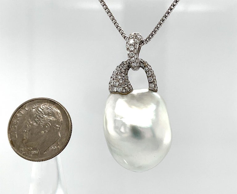 This exquisite, eye-catching necklace features an impressive South Sea white baroque pearl with gorgeous luster, set in 18k white gold with sparkling diamonds! The spectacular gem has lovely rainbow pearlescence and measures 22 x 18mm. Its elegant and uniquely dimensional shape is complimented by a sophisticated design and gives the pendant a timeless, yet organic feel that is perfect for both everyday and special occasion wear! Pendant measures approximately 1.5" long. 22 inch, 14k white gold chain included.