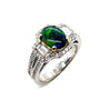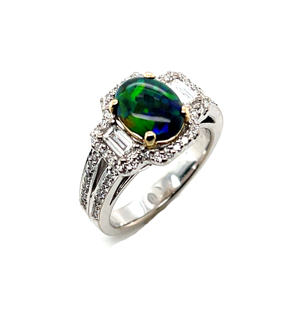 This 1.11 carat Australian black opal is set in 18k white gold with sparkling round brilliant and elegant baguette-cut diamonds. The opal is an exceptionally fine gem with vivid play-of-color, exhibiting vibrant green, blue, orange, and yellow patches. Striking diamond baguettes sit on either side of the opal, framed by round white diamonds that continue down the sides of the split shank. A beautifully luxurious ring that is perfect for daytime and evening wear!