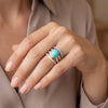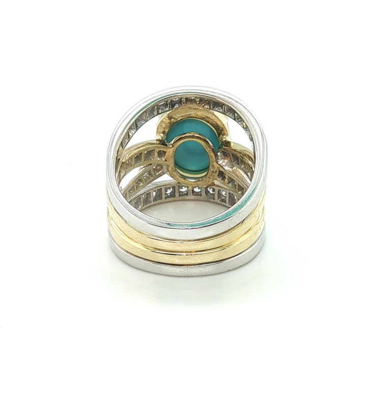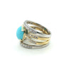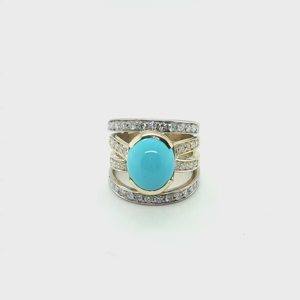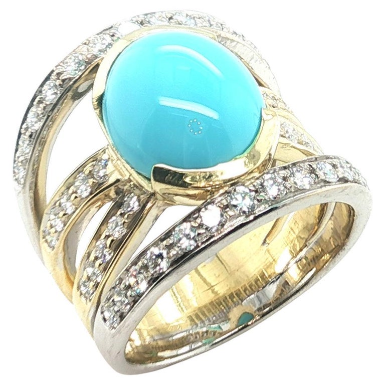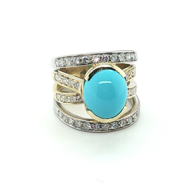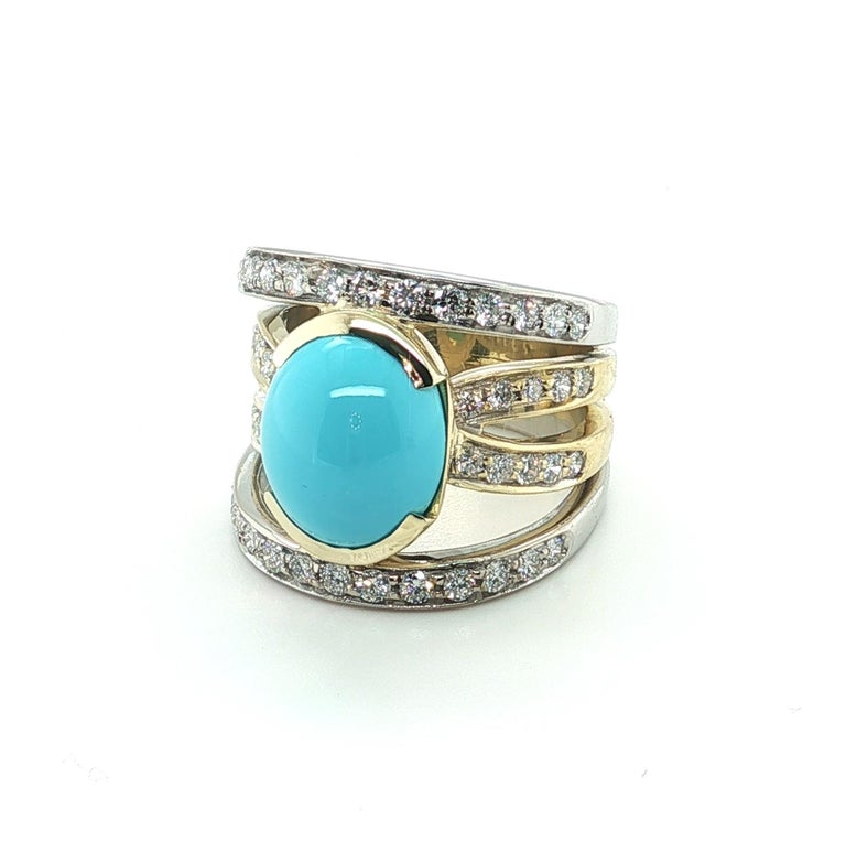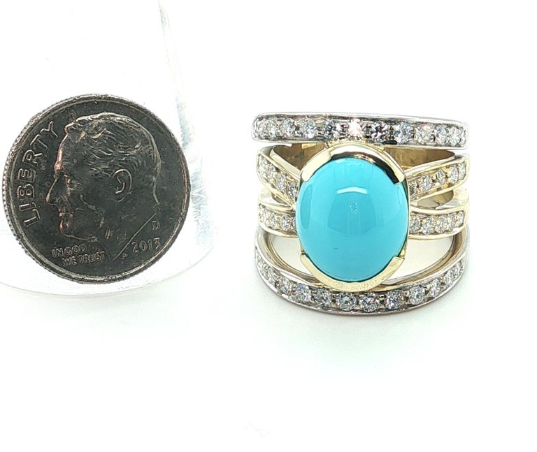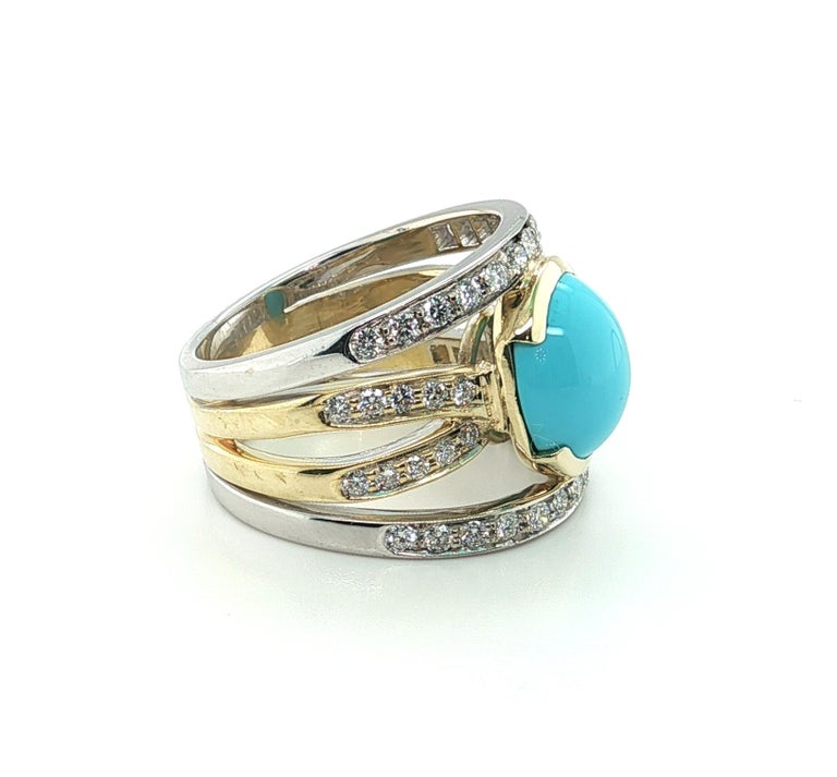 This impressive cocktail ring features a beautiful 5.70 carat Sleeping Beauty turquoise cabochon set with brilliant natural diamonds in 18k yellow and white gold. The Sleeping Beauty Mine in Arizona is renowned as one of the world's premier sources of fine turquoise. Since the mine's closure, gems from this source are becoming increasingly rare and sought after. This gorgeous turquoise cabochon has ideal "Robin's Egg blue" color and it is set in a half bezel that shows off the gem's thickness. 18k white and yellow gold lines are pave set with sparkling white diamonds, giving the wrap-around design eye-catching contrast and a luxurious appearance. This stunning ring measures 3/4" at its widest dimension and is a bold yet elegant statement piece that is perfect for every day and special occasions!