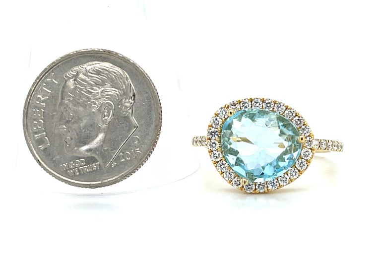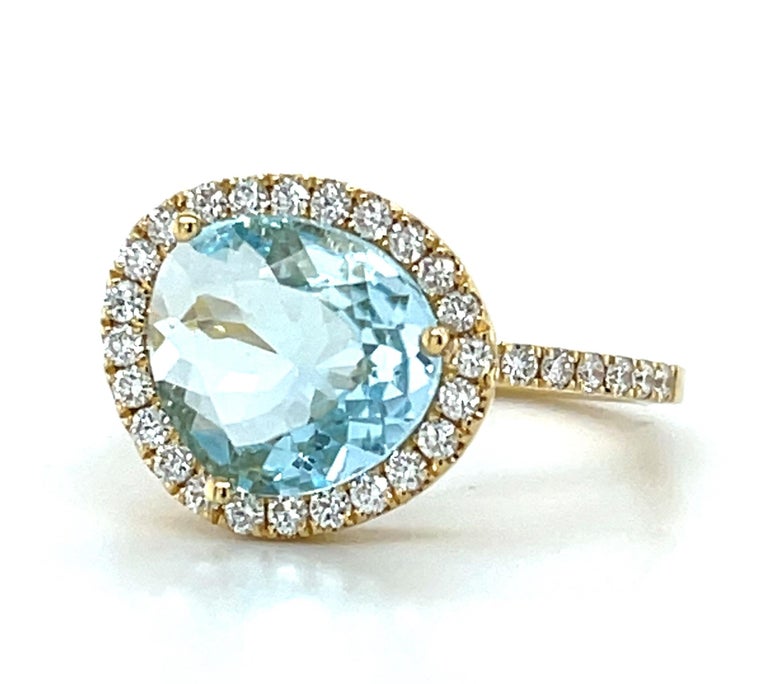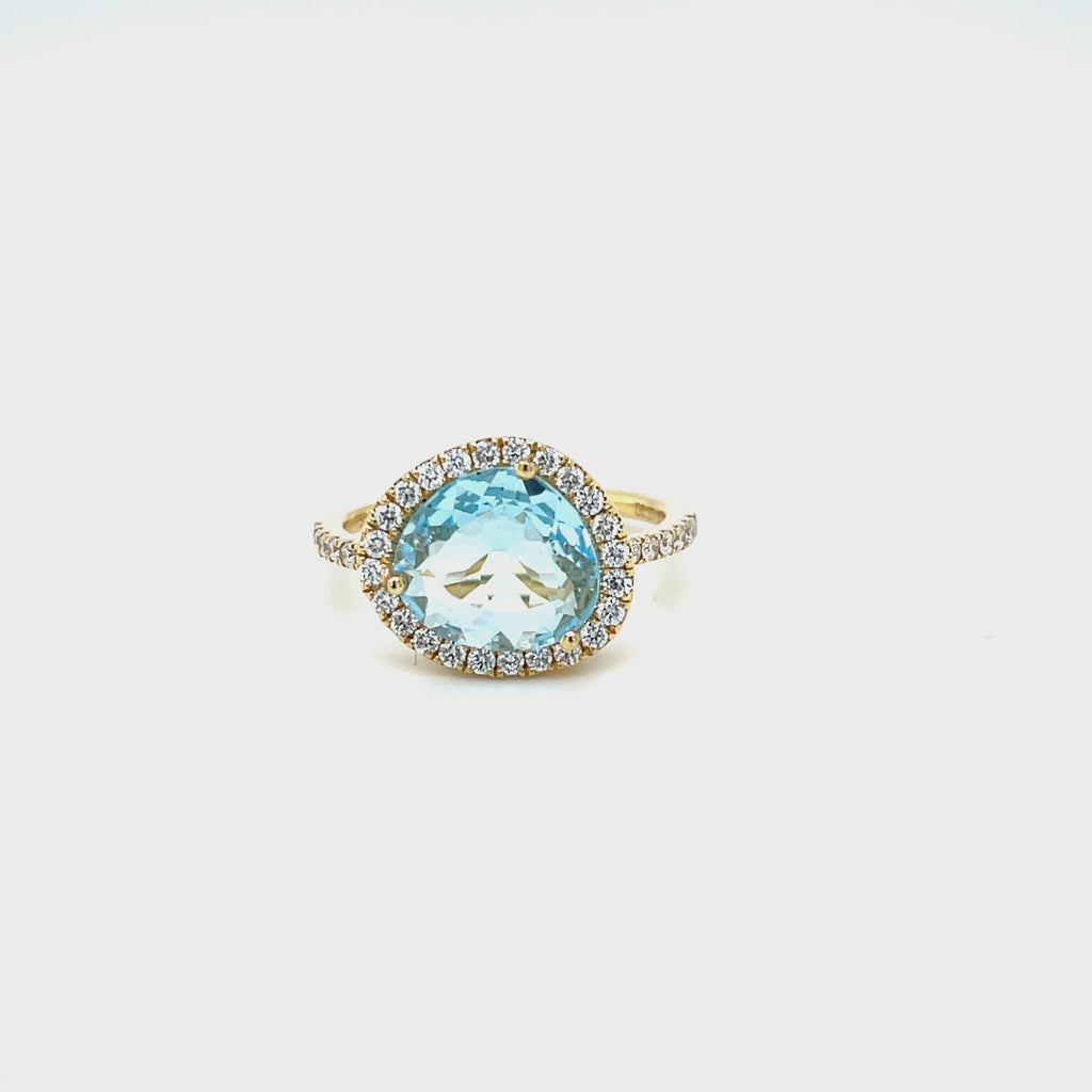 This stylish 18k yellow gold ring features a beautiful, crystal clear blue topaz framed by a halo of sparkling white diamonds. The 2.70 carat blue topaz has stunning sky blue color and is cut in an unusual "onion" shape that is so eye-catching! Brilliant white diamonds are set along each side of the elegant band, making this ring perfect for both daytime and evening wear. A unique and  versatile ring that will make a wonderful addition to your fine jewelry wardrobe!