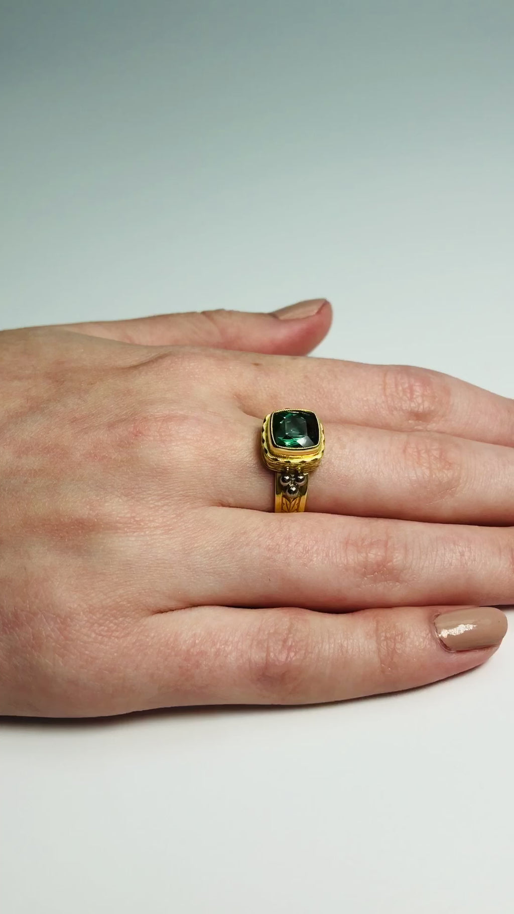 This beautiful ring features a richly colored, 1.58 carat chrome green tourmaline that has been set in a handmade 18k yellow gold bezel. The cushion-shaped gemstone has striking deep, emerald green color and is accented by two sparkling, round brilliant white diamonds. The sides of the band as well as the entire bezel have been intricately hand engraved with an ornate "quilted" pattern in one of our most popular signature custom designs. Handmade by our Master Jewelers in Los Angeles, this ring displays attention to detail and fine craftsmanship seldom seen today. Such a comfortable and wearable ring!
