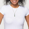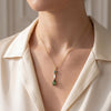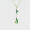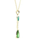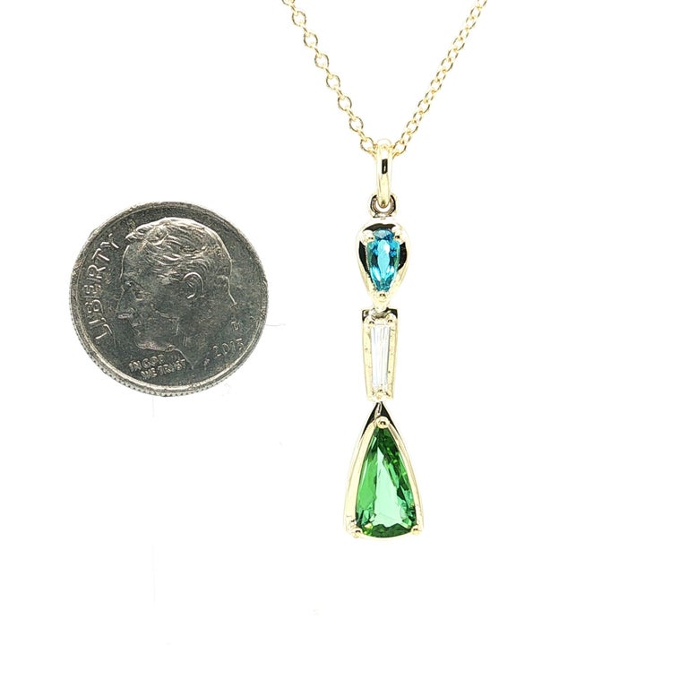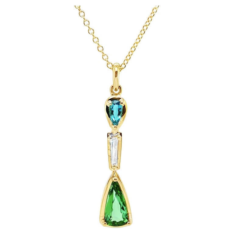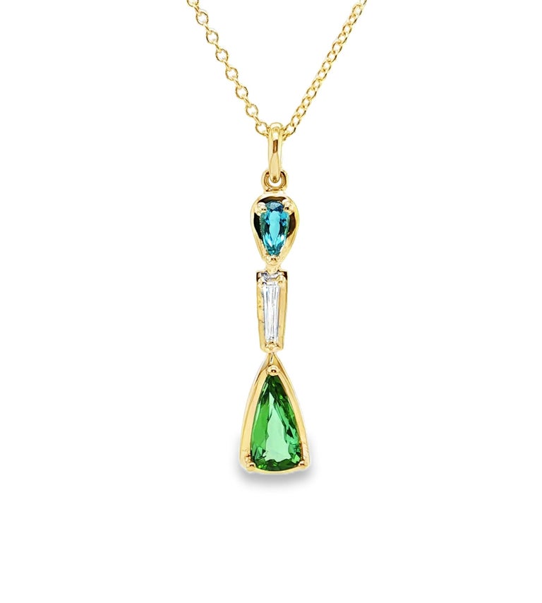This stunning pendant necklace features two gorgeous pear-shaped Paraiba tourmalines set with a tapered baguette diamond in 18k yellow gold. The larger Paraiba tourmaline is a beautiful green gem with an Origin Report from the Gemological Institute of America stating that it is from Brazil. The second Paraiba tourmaline is a classic neon blue Brazilian Paraiba weighing .24 carats. The gems are of extremely fine quality and exceptionally clean, exhibiting the quintessential colors of these rare stones. An elongated, .13 carat tapered baguette diamond is set between the two Paraibas in this elegant design. The pendant measures 1-3/8" in length, including the bail and comes with a lovely 18k yellow gold cable chain measuring 18 inches in length. Handcrafted by our Master Jewelers in Los Angeles, this one-of-a-kind, custom-designed pendant is a true collectible for the sophisticated buyer and perfect for any occasion!