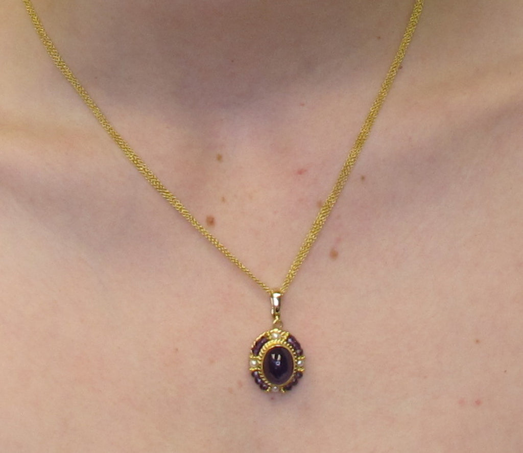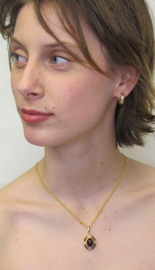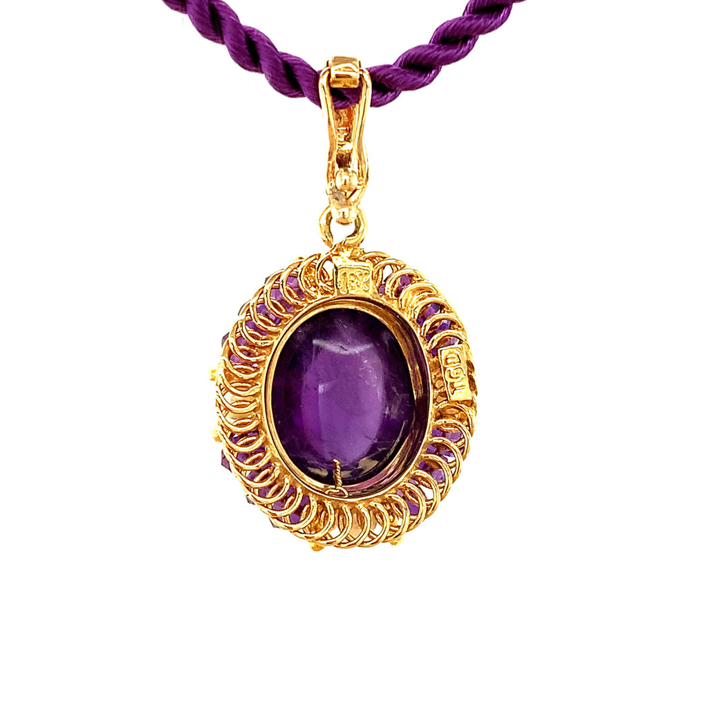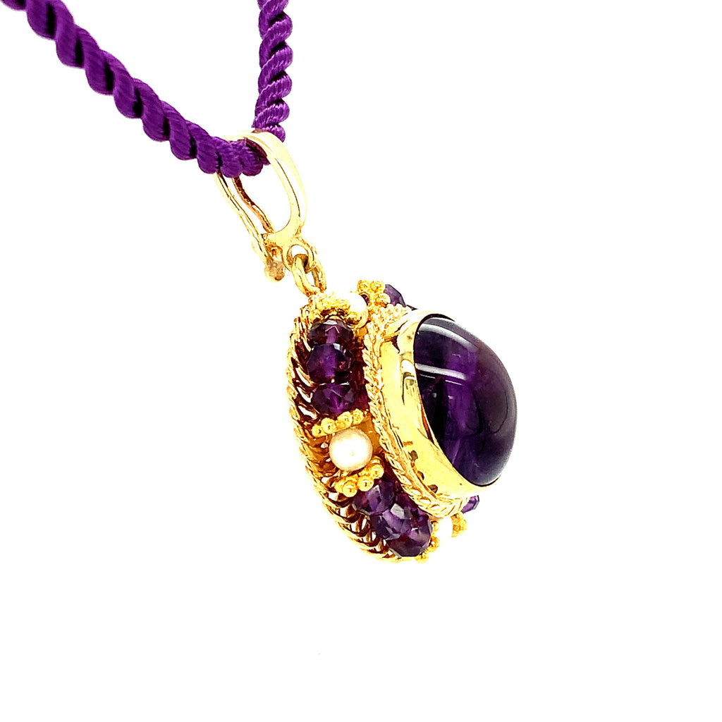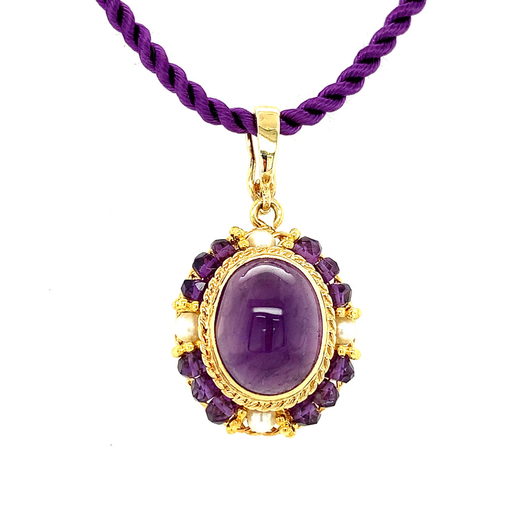 This elegant drop pendant features an oval amethyst cabochon with beautiful rich purple color, bezel set in a lovely handmade filigree setting. Amethyst beads and seed pearls are arranged in a halo frame around the center gem, accented with fine 18k yellow gold details. The Master Jeweler who created this pendant spent decades perfecting this timeless art with a level of skill rarely seen today. This is such a pretty piece, especially for anyone born in February or who just loves the color purple! 16" purple silk cord included.