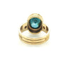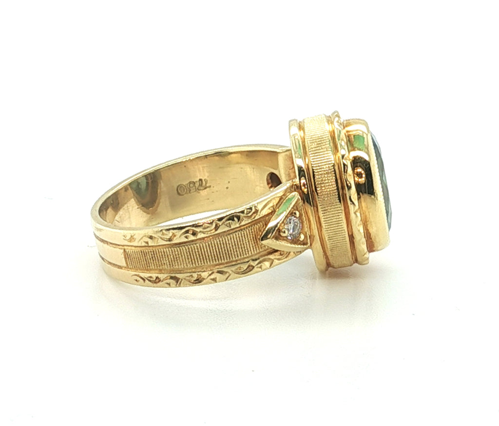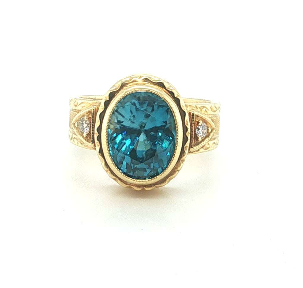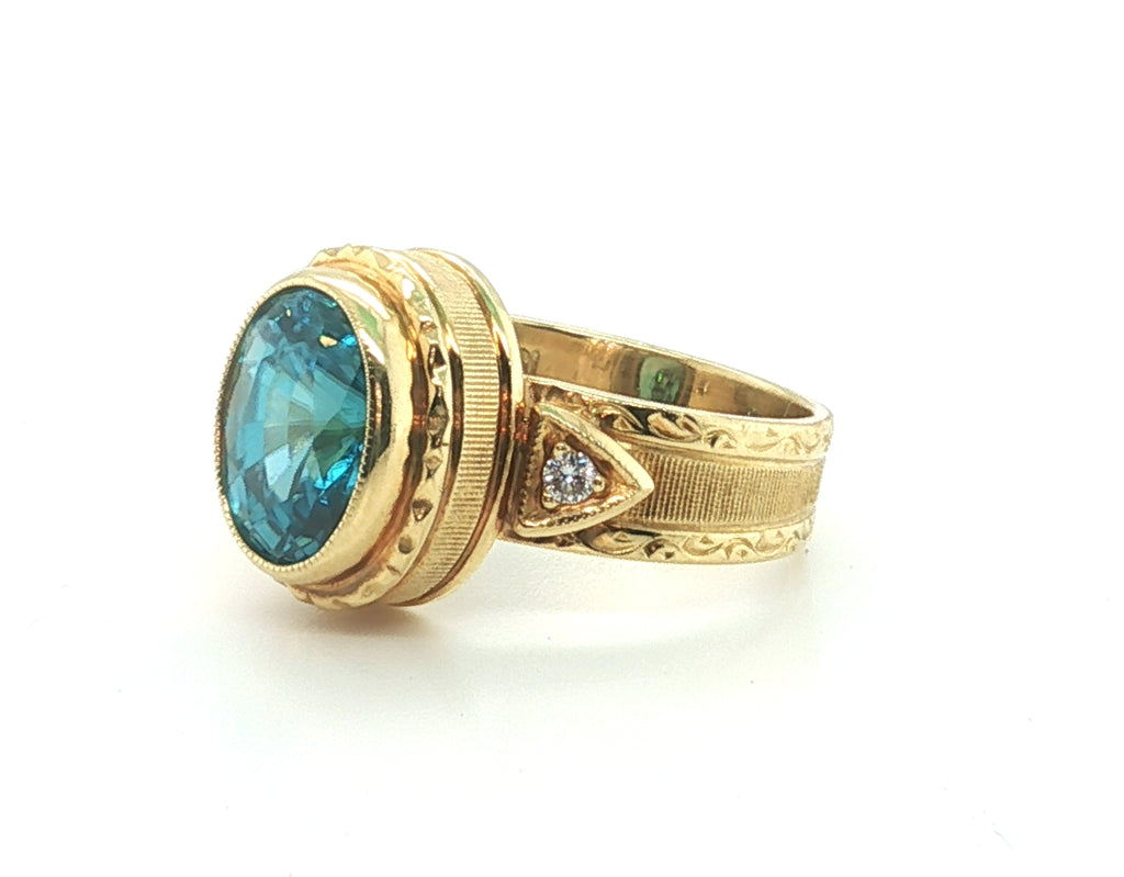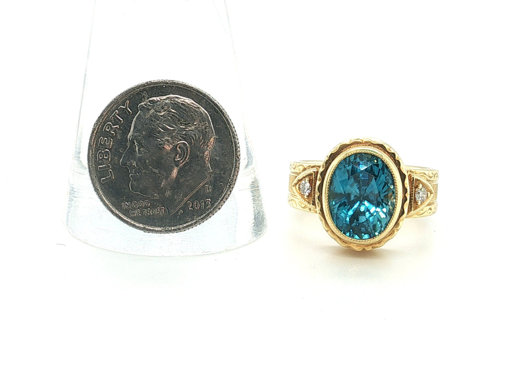 An extremely brilliant, "Windex-blue" zircon weighing 4.72 carats is featured in this handmade 18k yellow gold ring. The oval-shaped gemstone has beautiful, intense color and it is accented by two sparkling white diamonds. The sides of the band as well as the bezel have been intricately hand engraved with elegant patterns to further showcase this stunning center stone. Handmade by our Master Jewelers in Los Angeles, this ring displays attention to detail and fine craftsmanship seldom seen today. A comfortable and flattering design that can be worn on any finger!