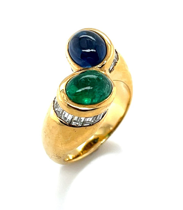 Emerald Cabochon, Sapphire Cabochon and Diamond Baguette Ring in 18k Yellow Gold