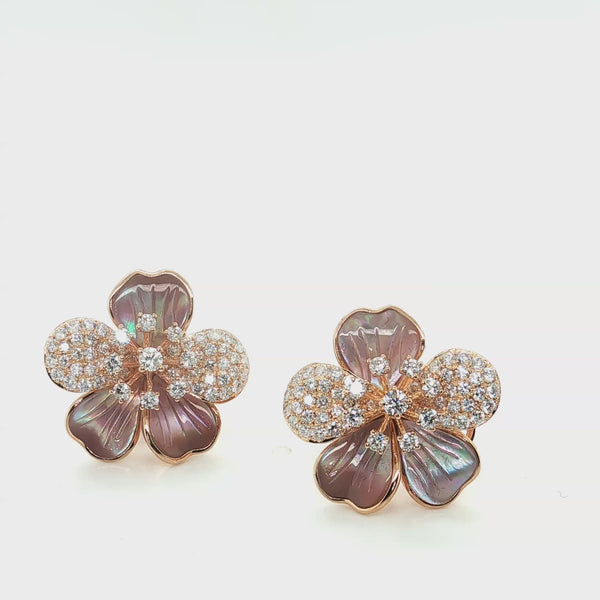 Hand Carved Wild Rose Mother-of-Pearl and Diamond Earrings in 18k Rose Gold