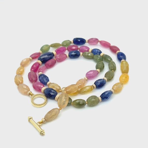 Natural Multicolor Sapphire Beaded Necklace with Yellow Gold Accents, 21 Inches