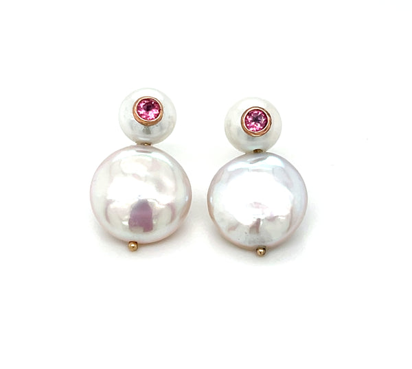 12mm Coin Pearl and Faceted Pink Spinel Post Earrings in 14k Rose Gold
